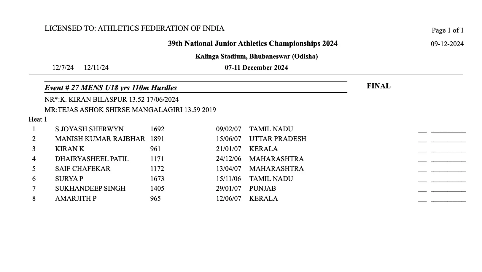 In a brilliant display of athleticism, Kiran K of Kerala just broke the national record in Junior Men's U18 110m hurdles!