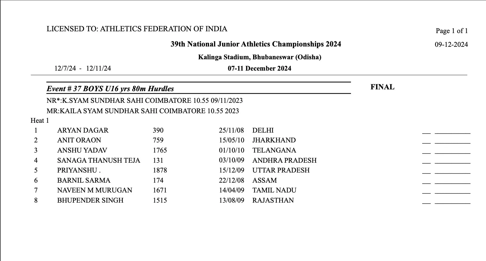 In the semi-finals of the Boys U16 80m hurdles, two athletes, Anshu Yadav and Sanaga Thanush Teja broke the Syam Sundhar's national record and meet record set in 2023.