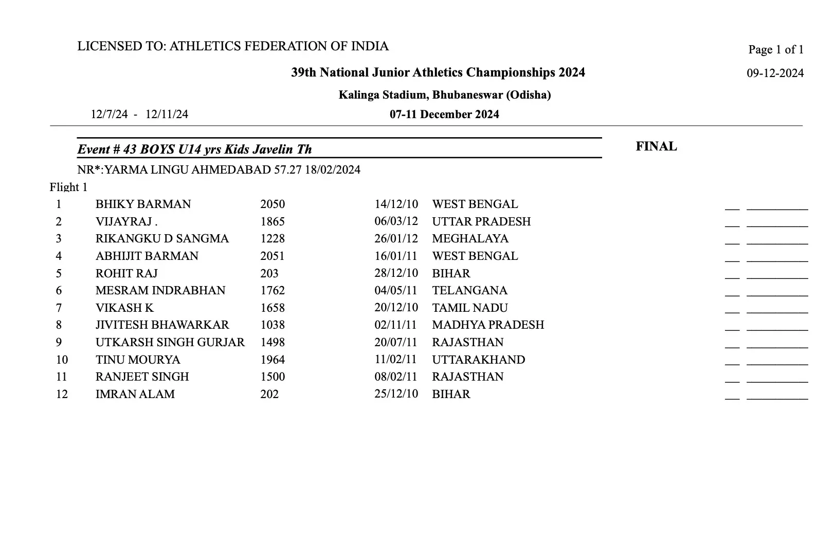 With a throw of 59.64m, Bhiky Barman of West Bengal broke the U14 Boys Javelin Throw NR that was held by Yarma Lingu of Assam.