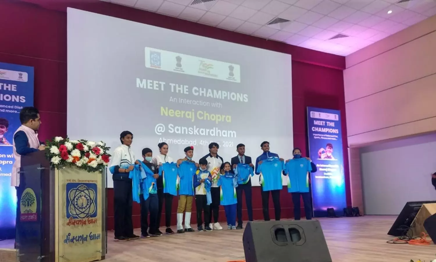 Tokyo Olympics gold medallist Neeraj Chopra on Saturday launched an ambitious outreach programme that connects India's ace athletes with school children. On the occasion, he met with students from 75 schools and emphasized a balanced diet, fitness and sport during an interaction organized at Ahmedabad's Sanskardham School.