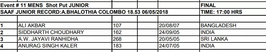 India has two representatives in the final of junior men's shot put final alongside one each from Bangladesh and Sri Lanka.