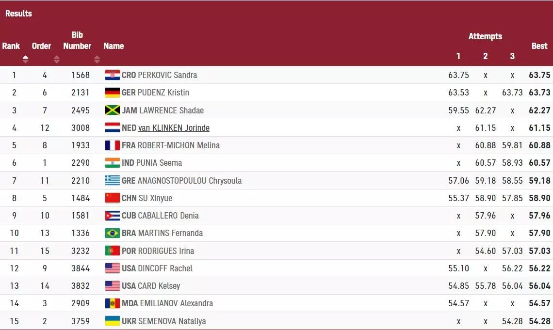 Sandra Perkovic is currently the best in the group with a 63.75m and she's closely followed by Kristin Pudenz in second place who hit 63.73m in her third and final attempt.