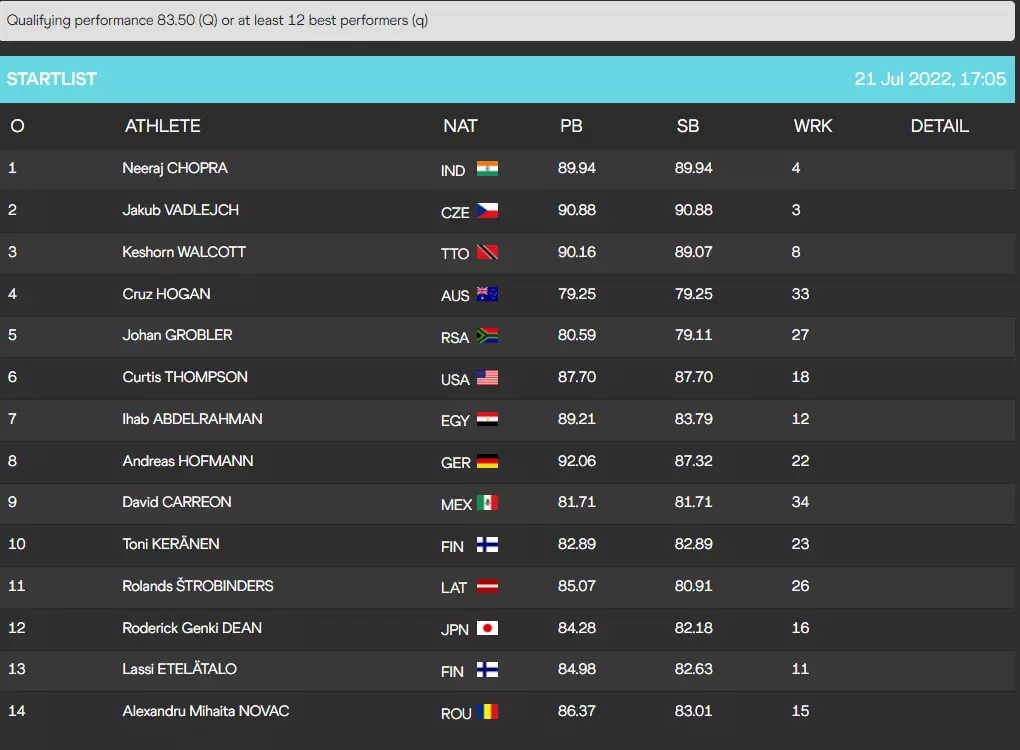 Neeraj Chopra will be the first athlete to throw the men's javelin in this edition of World Championships. He is pitted against Jakub Vadlejch - the Czech Republican who finished second to him in Tokyo and big names like Keshorn Walcott, Andreas Hoffman among others.