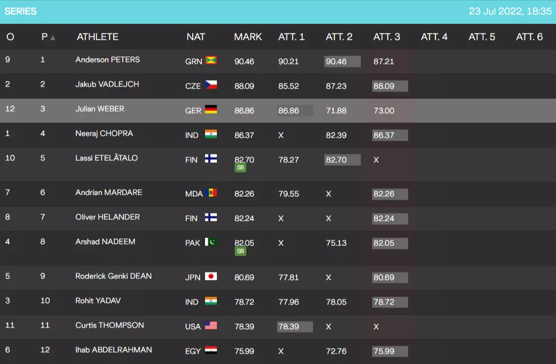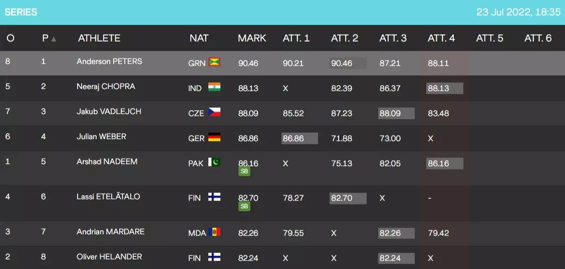 Anderson Peters sits comfortably at the top and Neeraj is closing on to him as we setup for an interesting finish.
