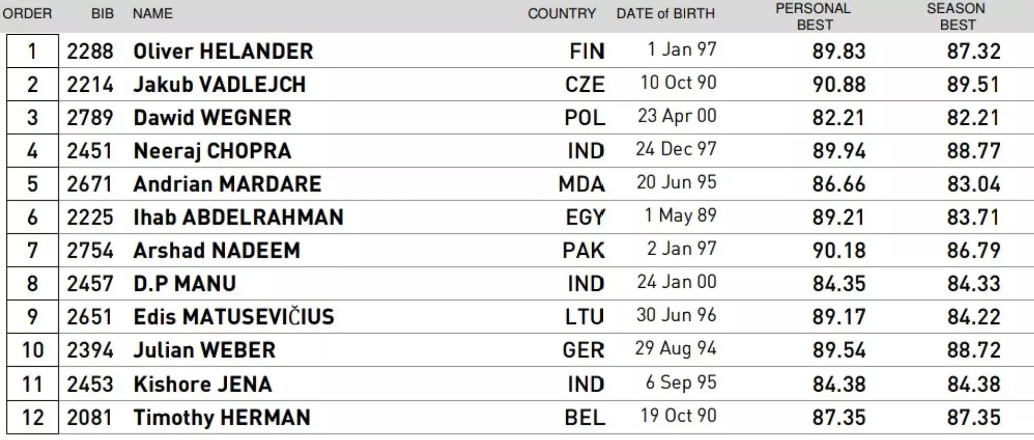 Order of throw for each thrower will remain same in first 3 attempts. Neeraj is 4th, Manu 8th and Jena 11th.