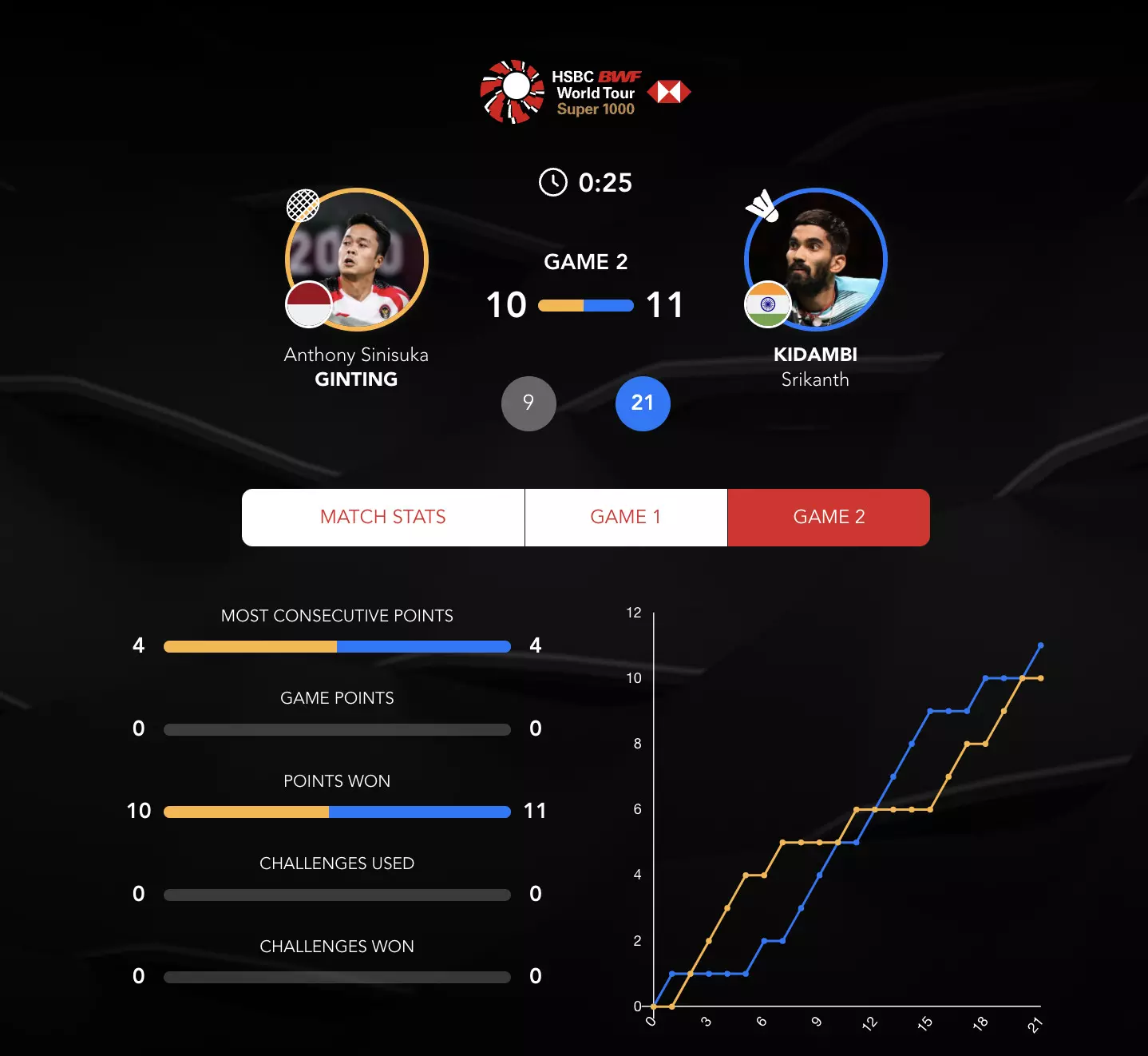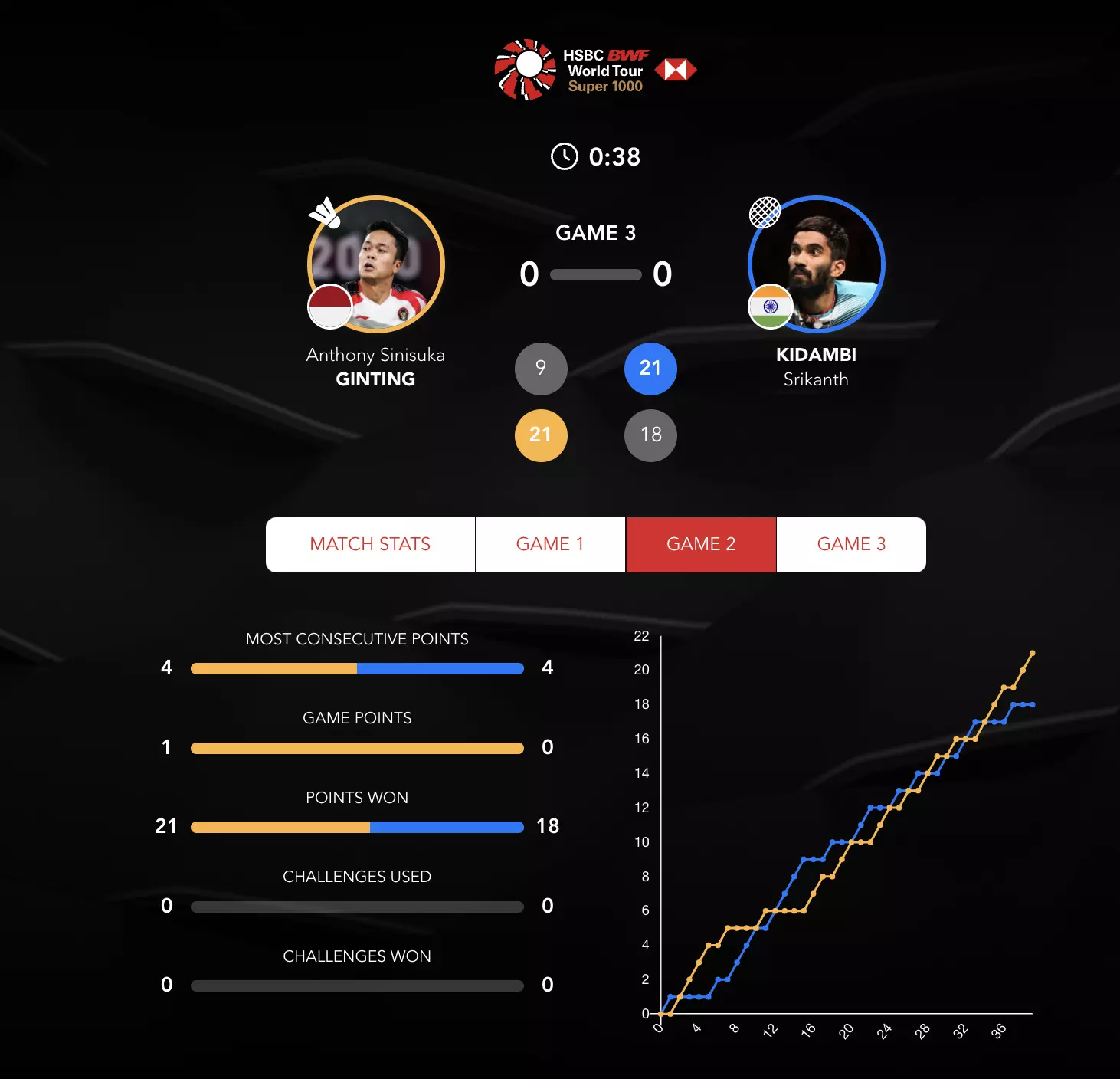 Game 2 has turned into quite the thriller with some mad rallies now! Srikanth under pressure from Ginting who has bounced back.