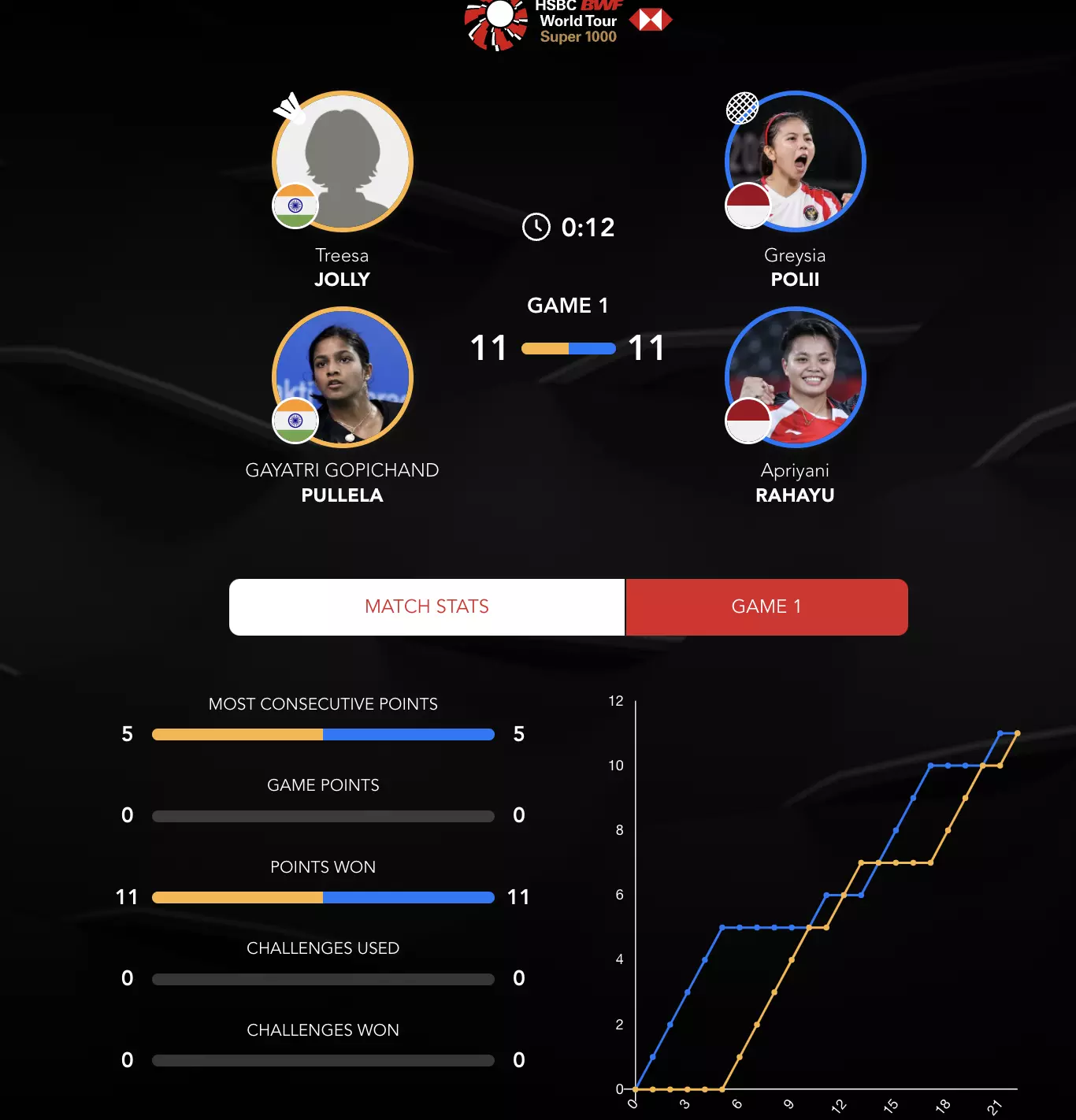 Gayatri and Treesa are playing well today and has good reflexes on display as they return shots well. However, the Olympic champs power through in the clutch points to take the opening game, 21-18 in a hard-fought 23 mins!
