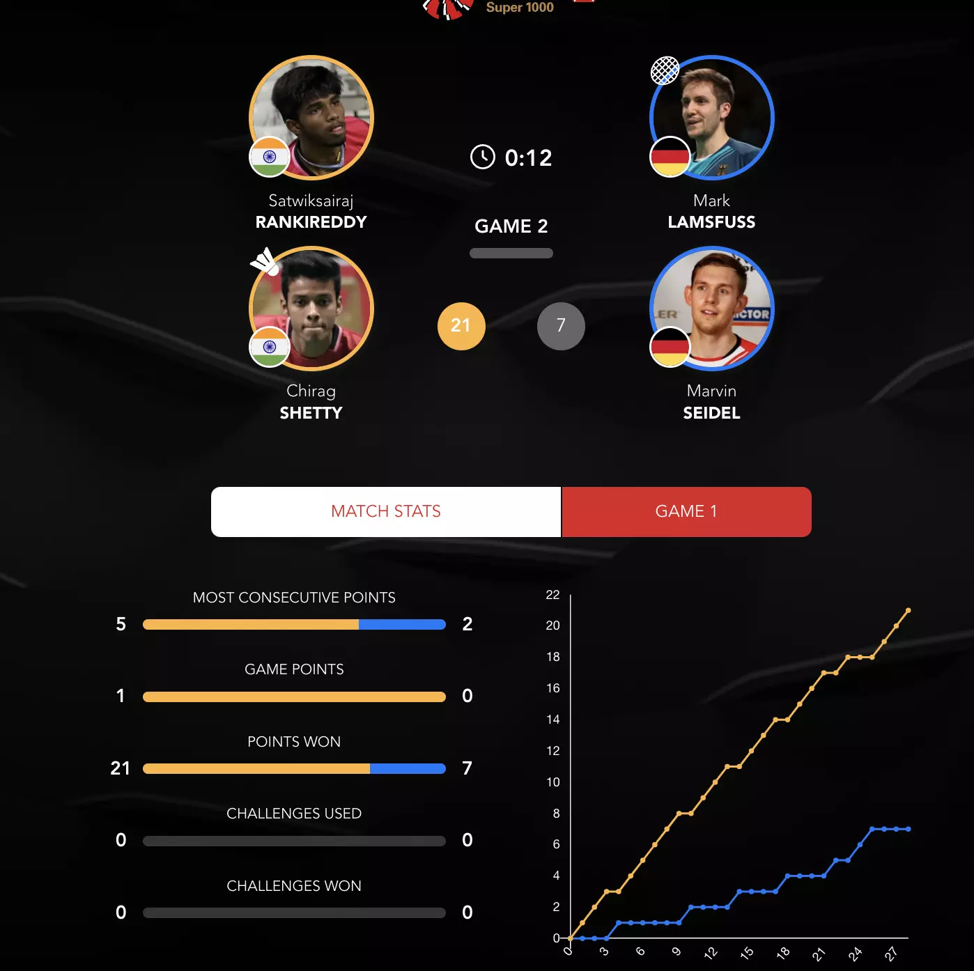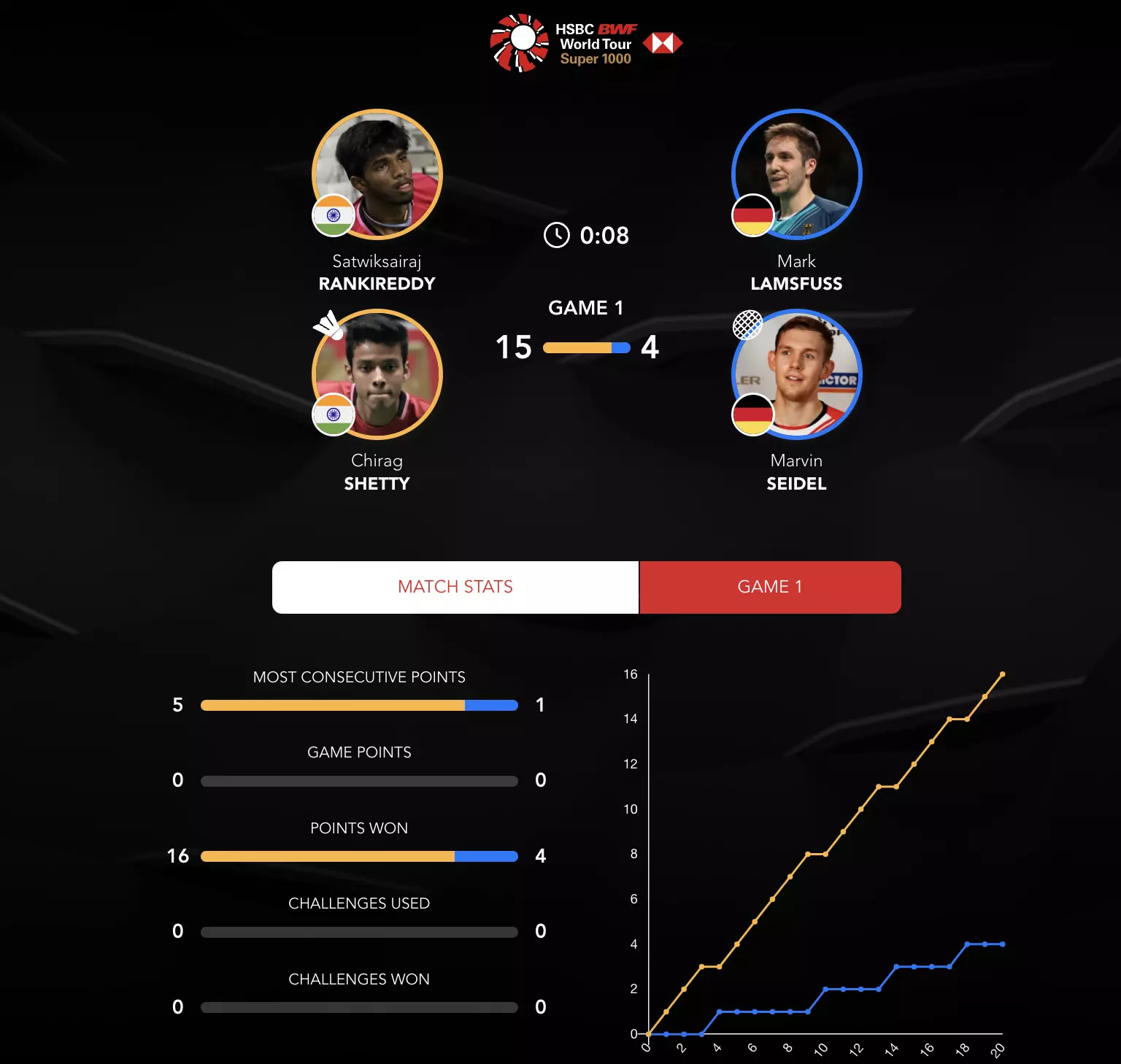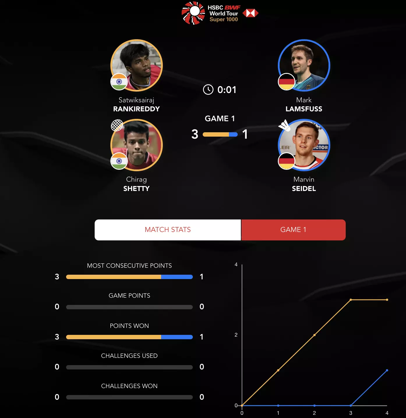 While Sindhu is fighting off Takahashi in the other clash, let's also get you some of the Men's Doubles action as India Open champs Satwiksairaj Rankireddy-Chirag Shetty get ready to face off against German pair of Mark Lamsfuss and Marvin Seidel for a place in the quarters!