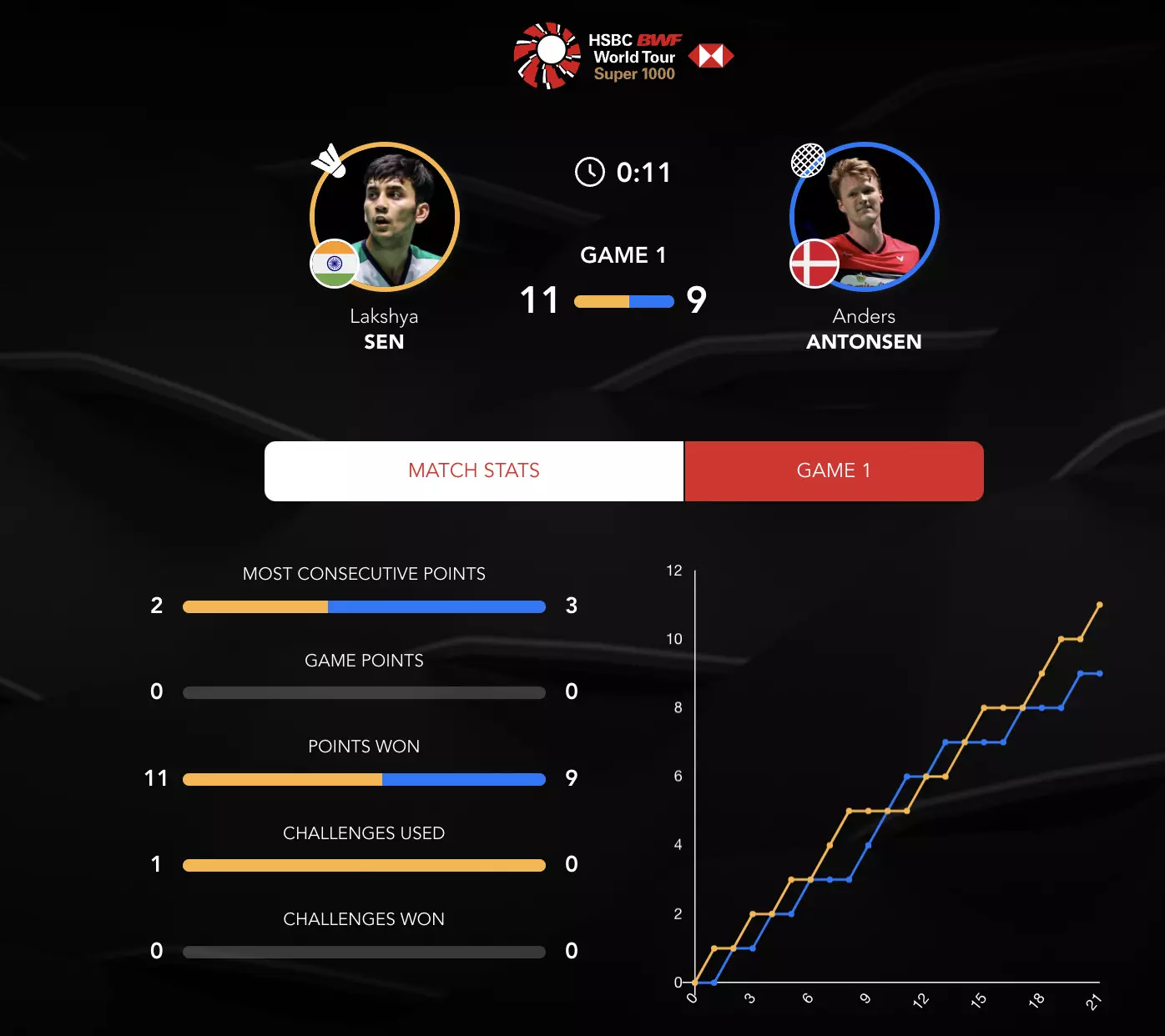 Antonsen is having difficulty with the lengths of Lakshya's shots but Lakshya can't complain. He has the lead at 11-9! Let's go!