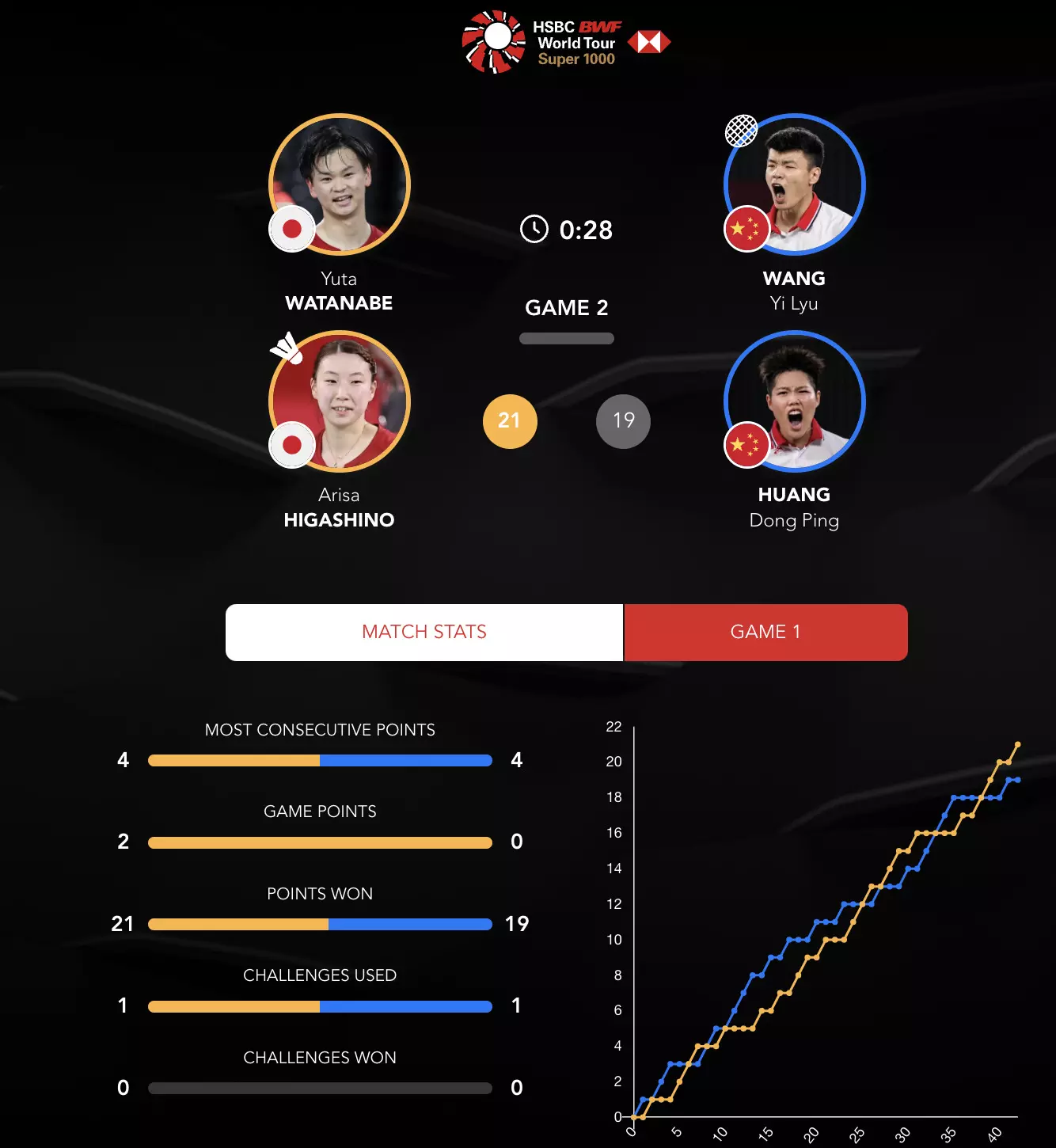 It's a Japan vs China clash here at the Mixed Doubles final and Yuta Watanabe and Arisa Higashino have really set things on fire here - what mad shots!