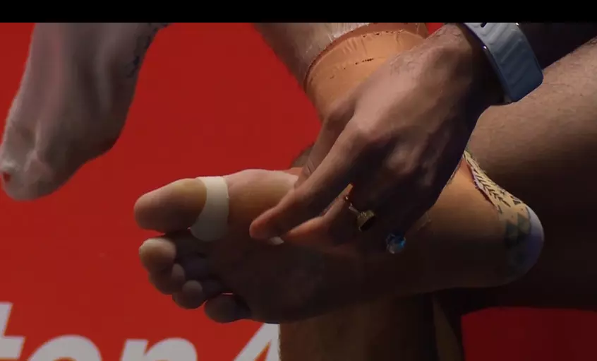 Lakshya Sen once again tending to his blister in the break. He will have to be his absolute best in the decider to break through Lai's defences.
