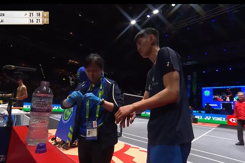 Victor Lai made a diving retrieve in the last rally and seems to have picked up an injury. He is bleeding from his right ring finger and requires medical attention.