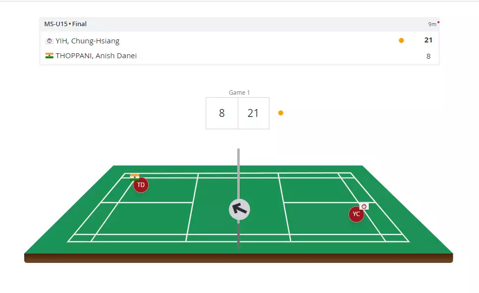 This does not look good at all for Anish Danei Thoppani as he surrenders the first game 8-21. He is struggling to keep the shuttle in play, let along put up a fight. A lot of errors from the Indian in that first game, and he has a lot to ponder about now.