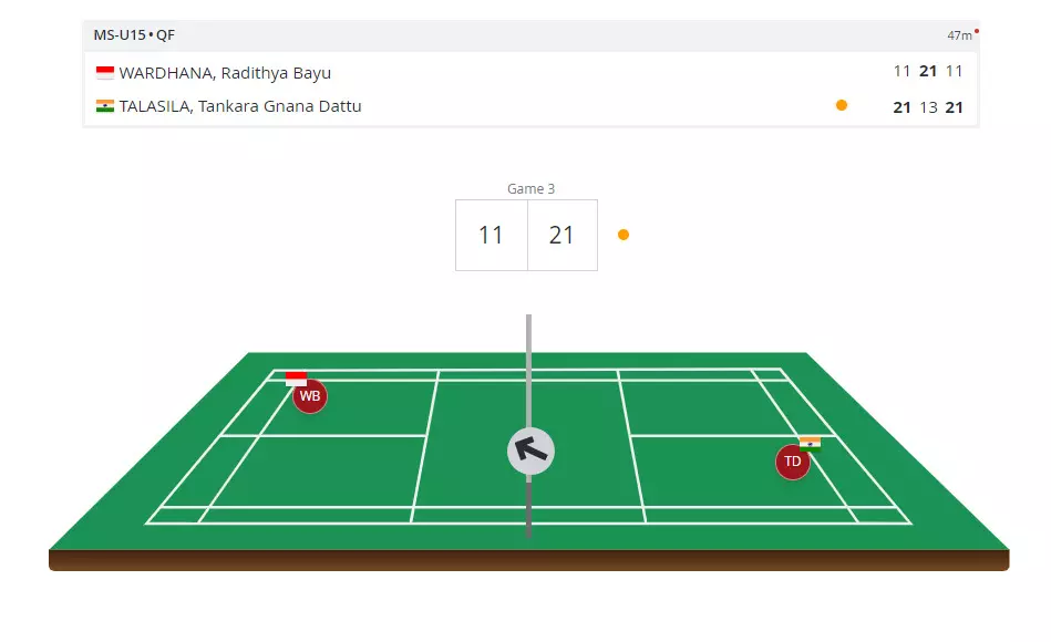Tankara Gnana Dattu Talasila is through to the semifinals of U15 Men's Singles. He wins a hardfought match 21-11, 13-21, 21-11.