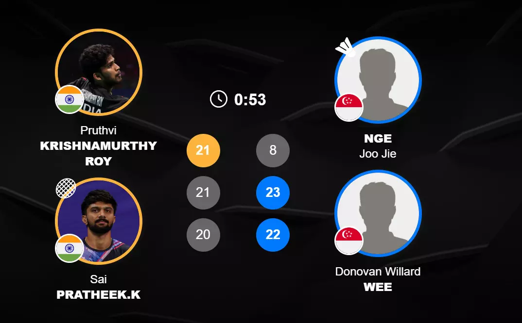 Much, much better in the second game from the Singaporeans. They push the Pruthvi-Sai to the limit to win it 23-21 and force the Indians into a decider.