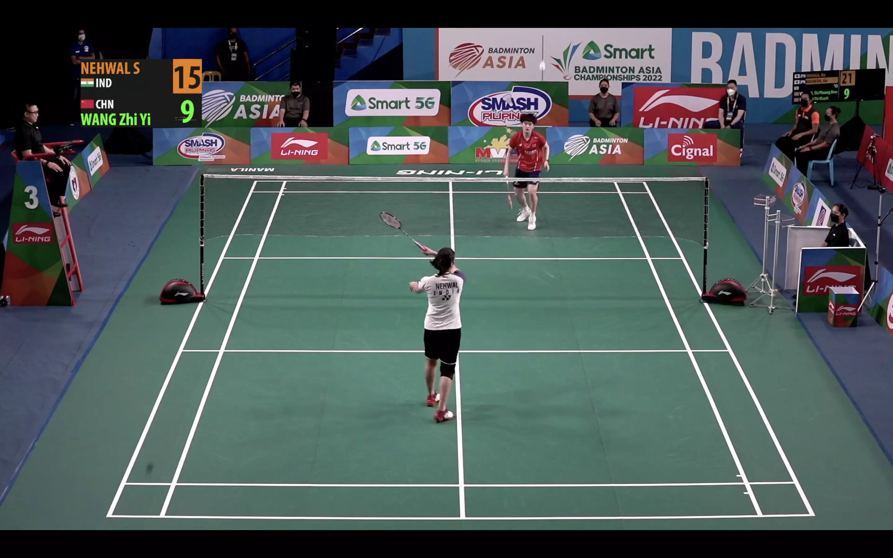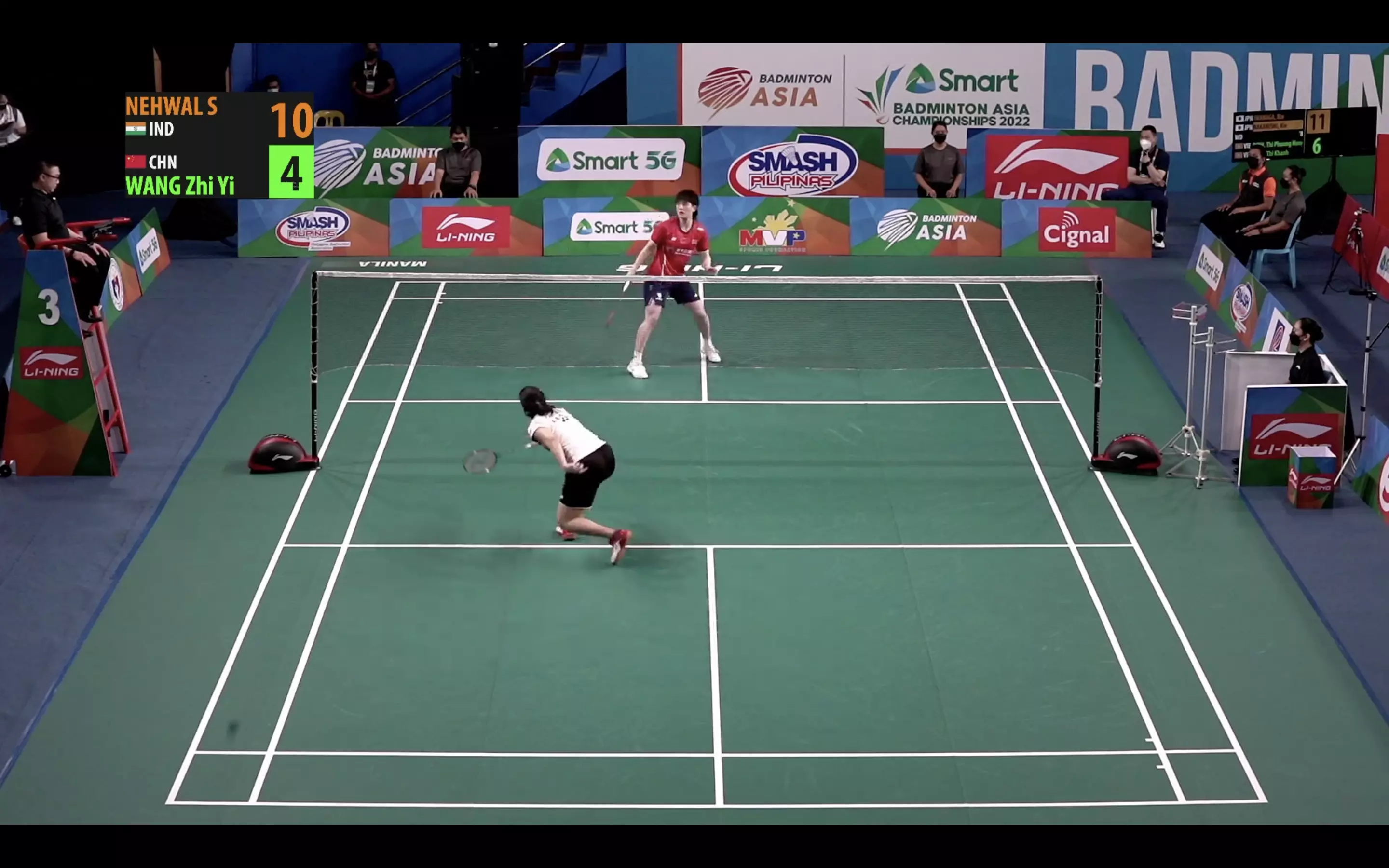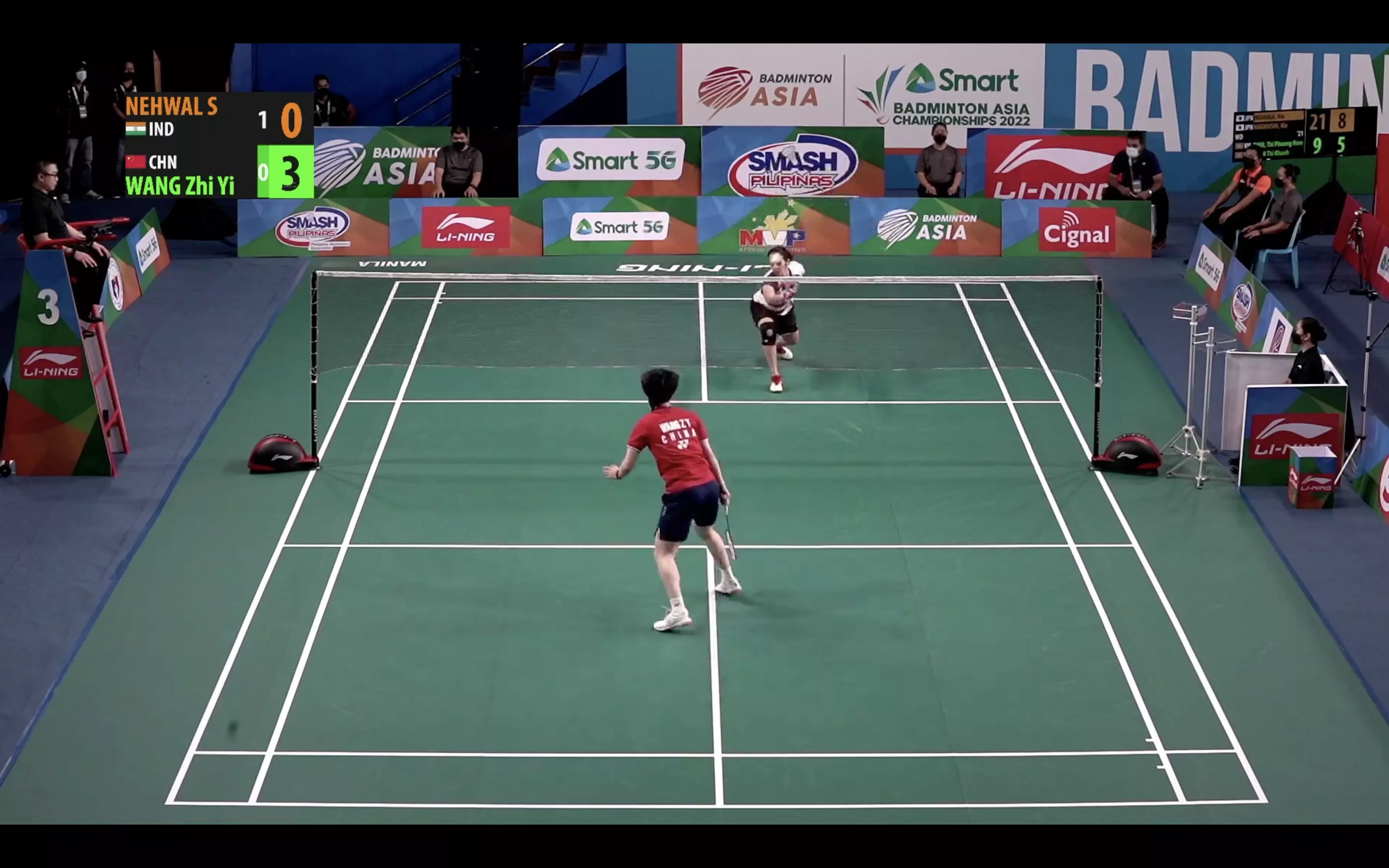 Wang Zhi Yi, the World No. 16 from China is moving around quickly and Saina's movement is affecting a few of the points here.