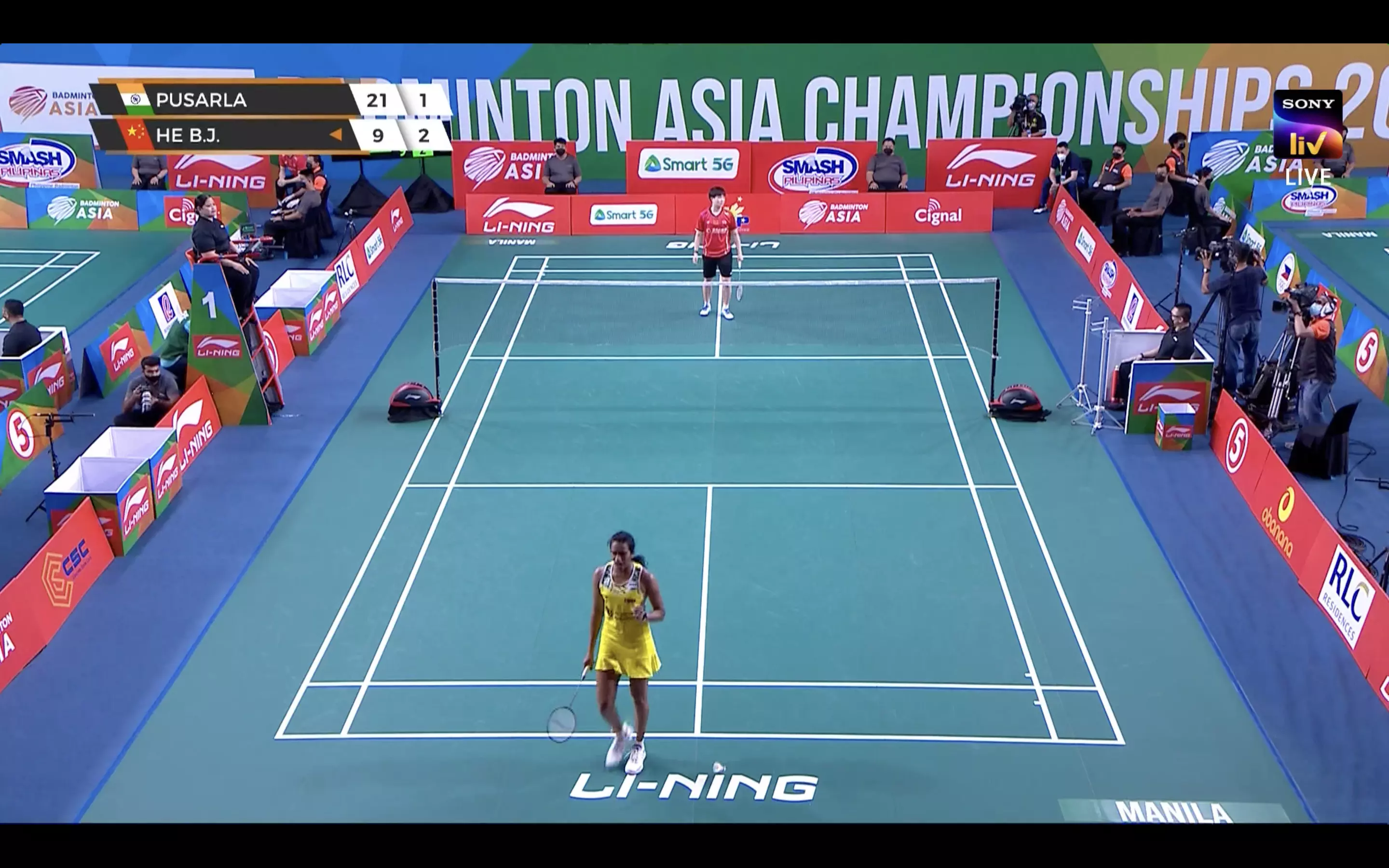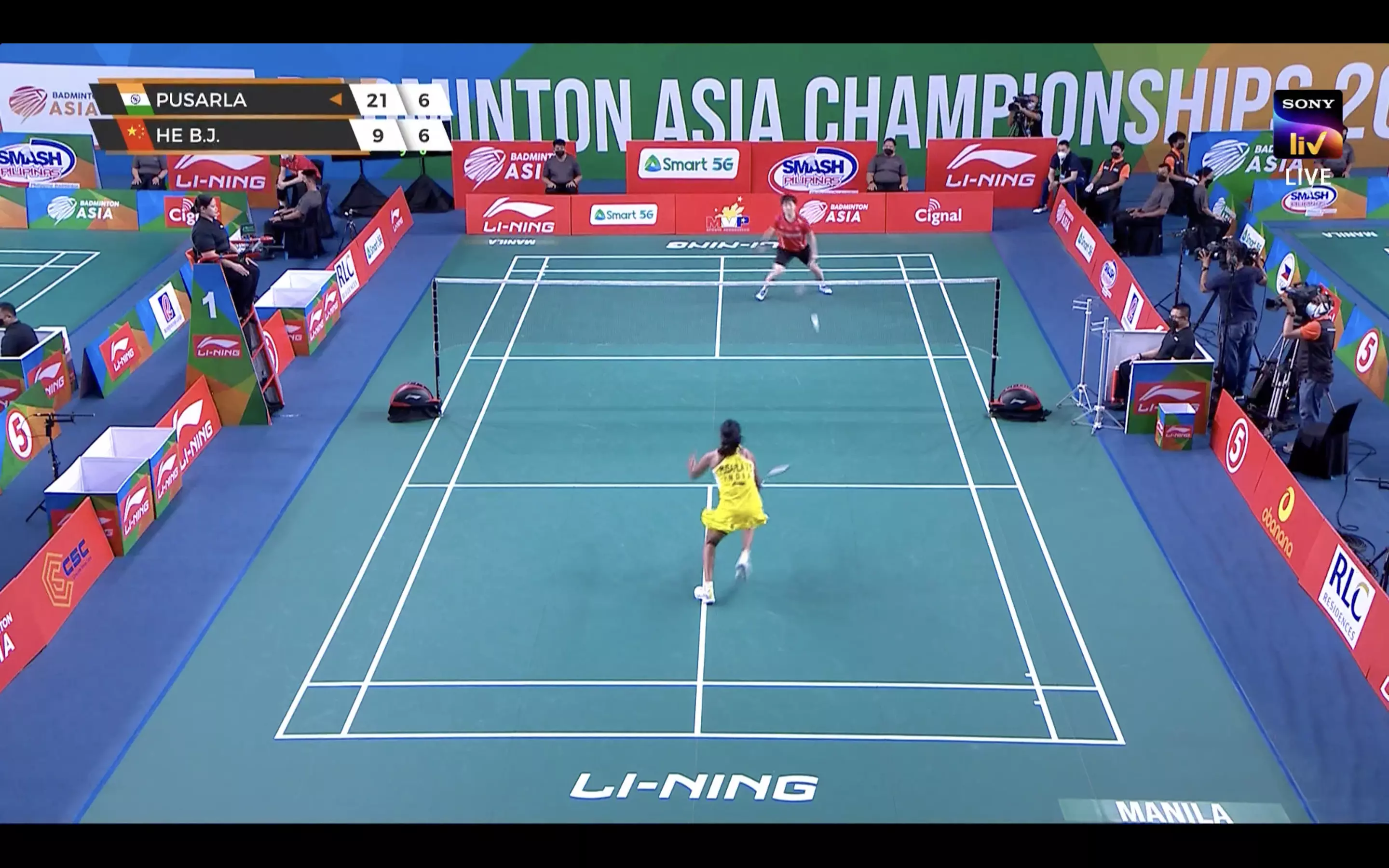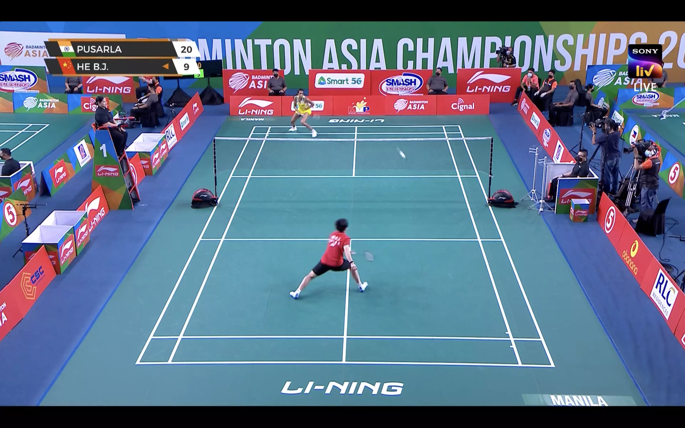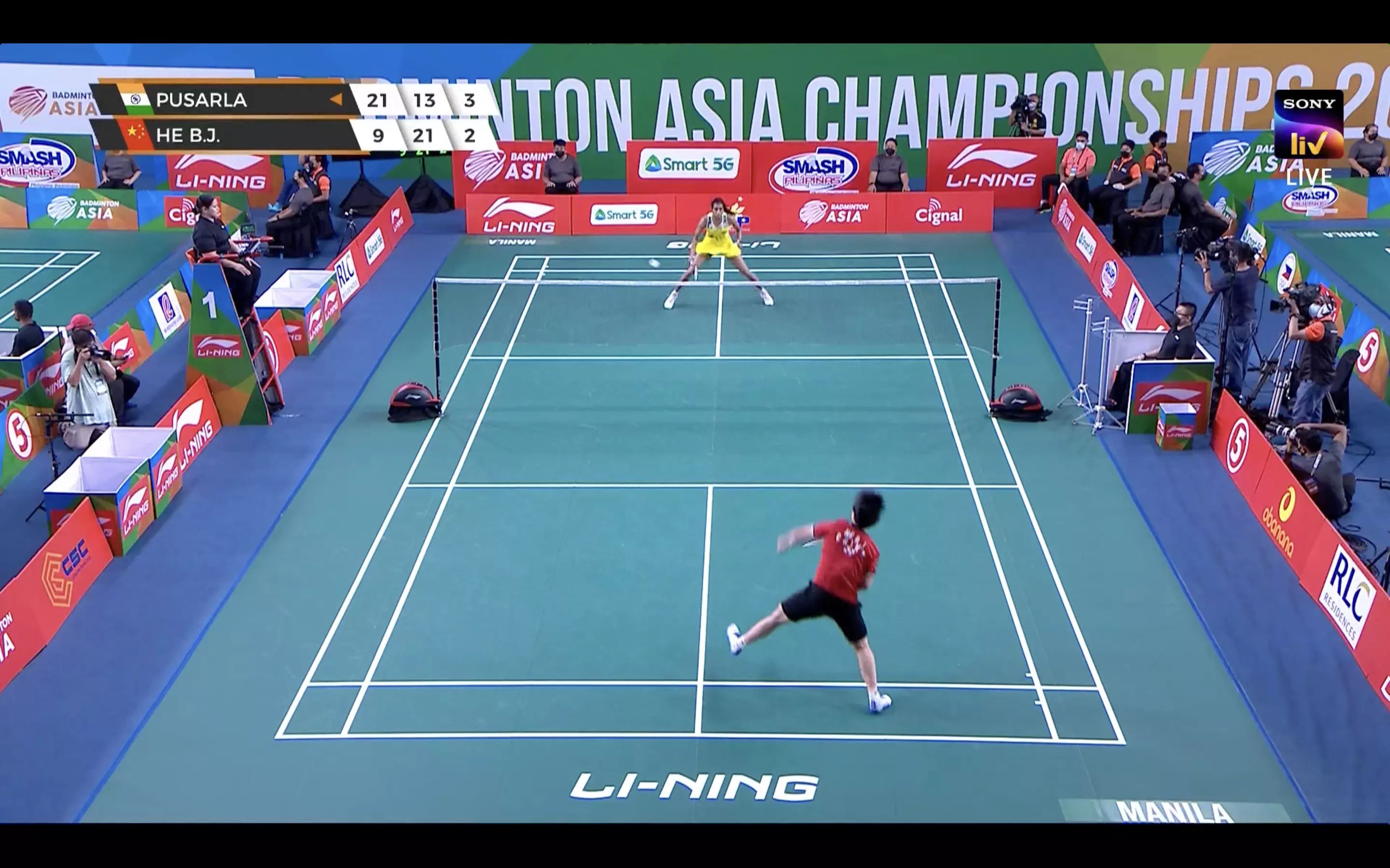 Sindhu and He Bingjiao stick near the net but the Chinese launches surprise attacks and are bothering Sindhu at the forehand.
