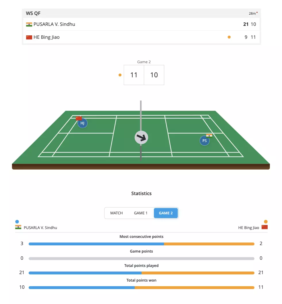 Into Game 2, He Bingjiao is playing much closer and there is pressure on Sindhu. The unforced errors are piling for He Bingjiao but Sindhu will also need to be more careful and aware of the deceptions.