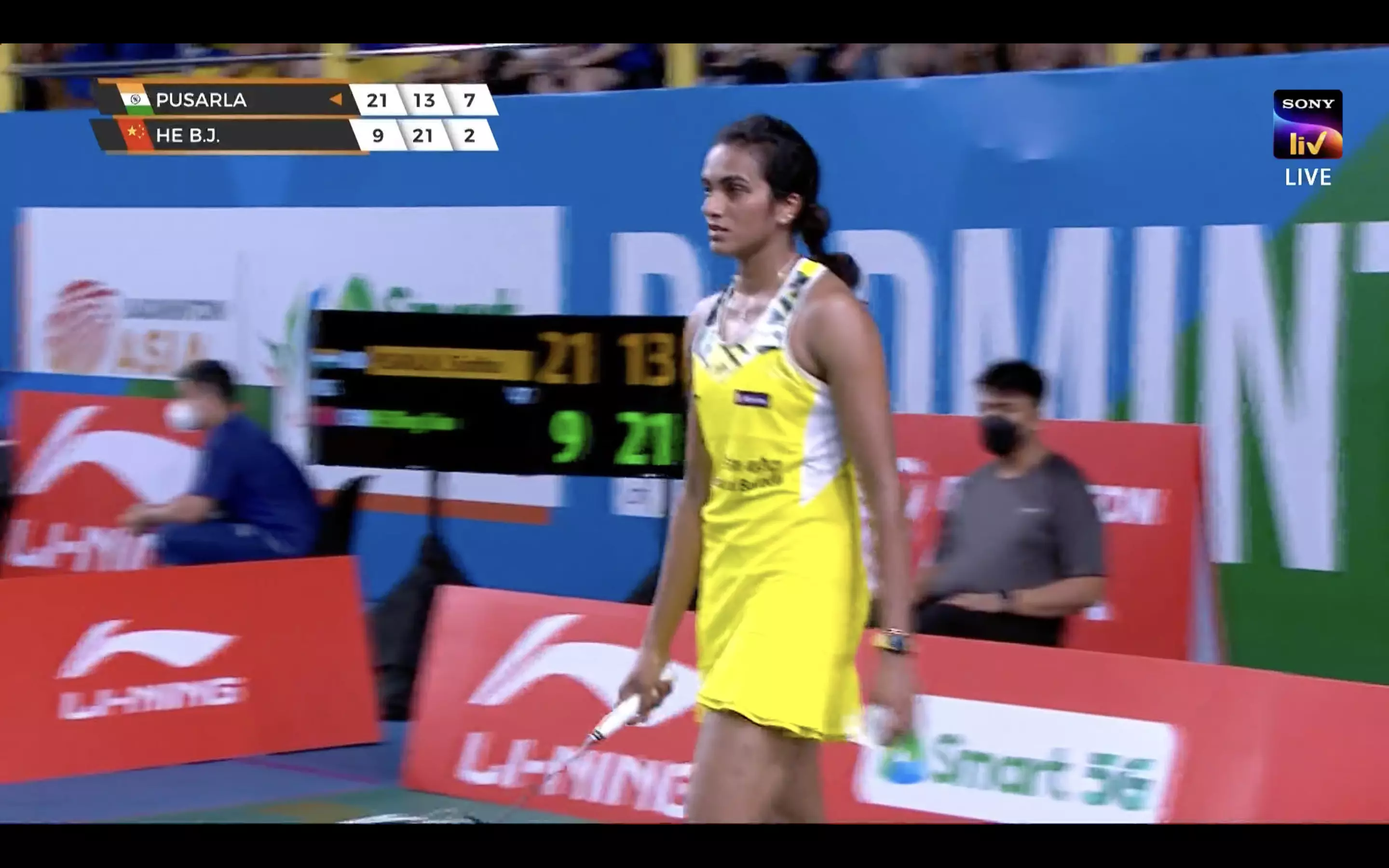 A boisterous fist pump and Sindhu seals the first game 21-9!
