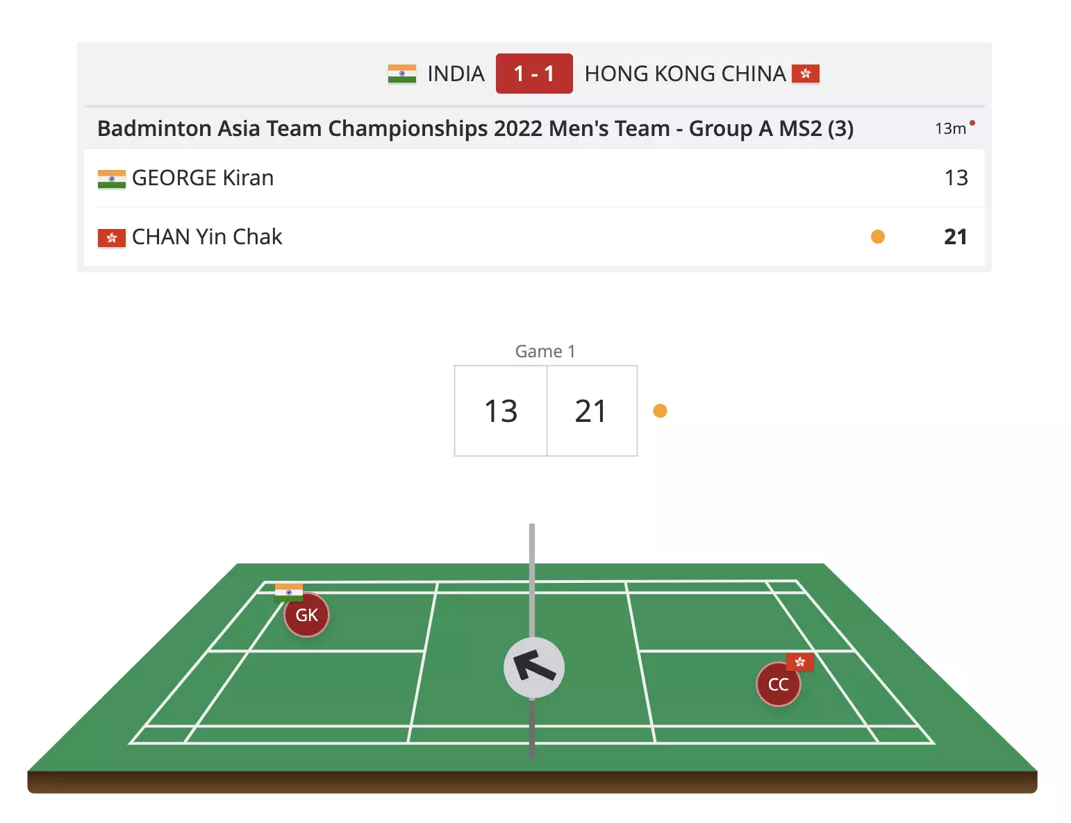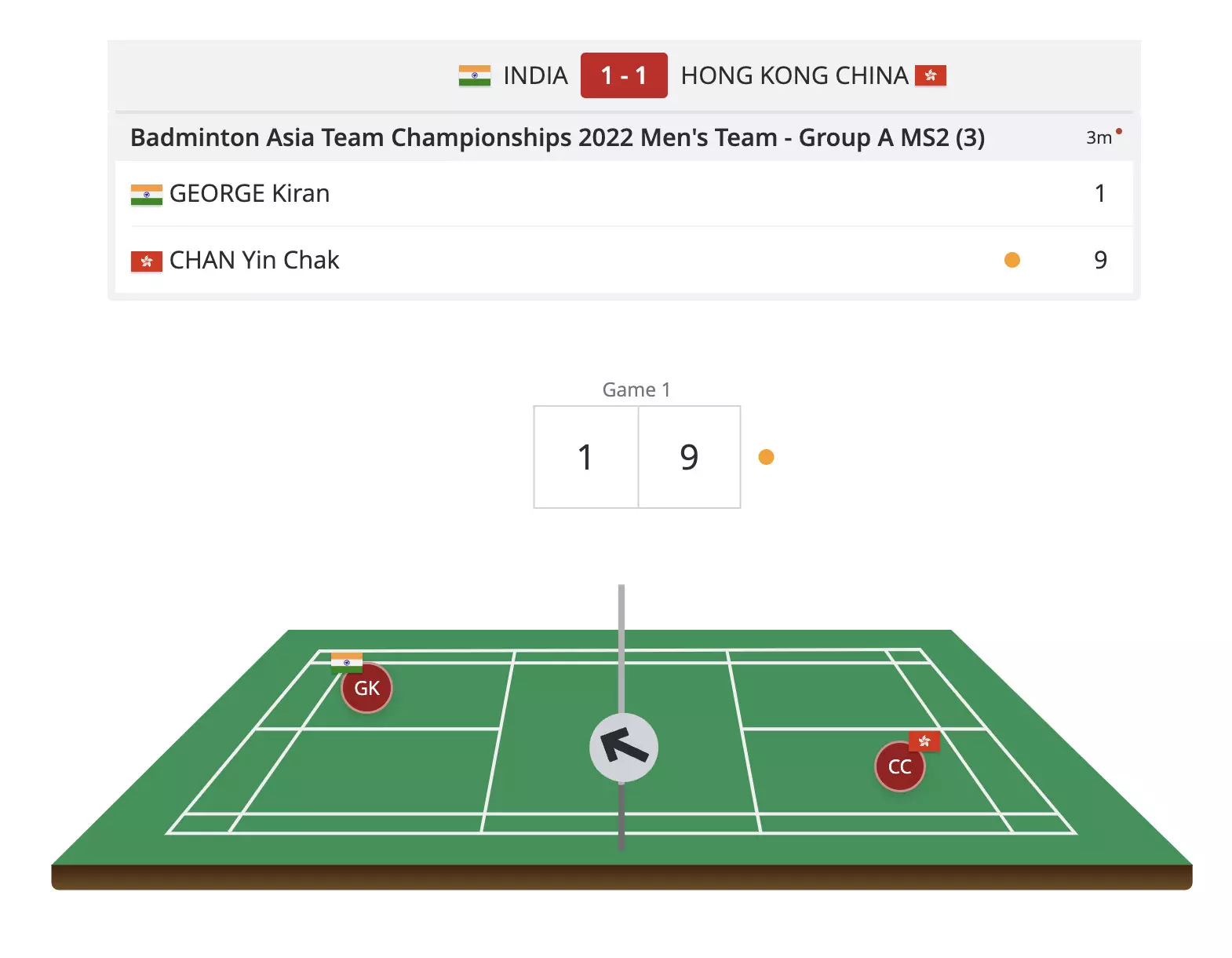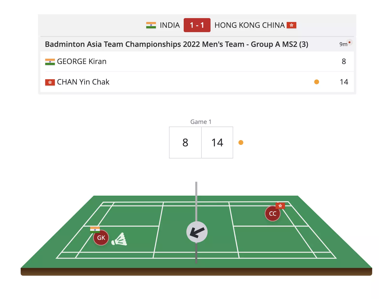 Chan Yin Chak attacks from the get-go and Kiran George is well on the back foot as the Hong Kong player leads 9-1.