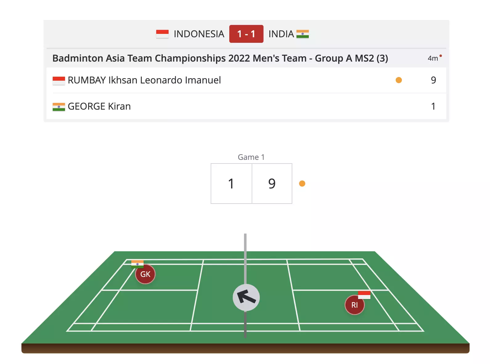 Indonesia 1 - 1 India#badminton #badmintonasia #unitedintriumph #BATC2022 pic.twitter.com/g2VEHU1XpV - 18 Feb 2022 3:55 AM GMT