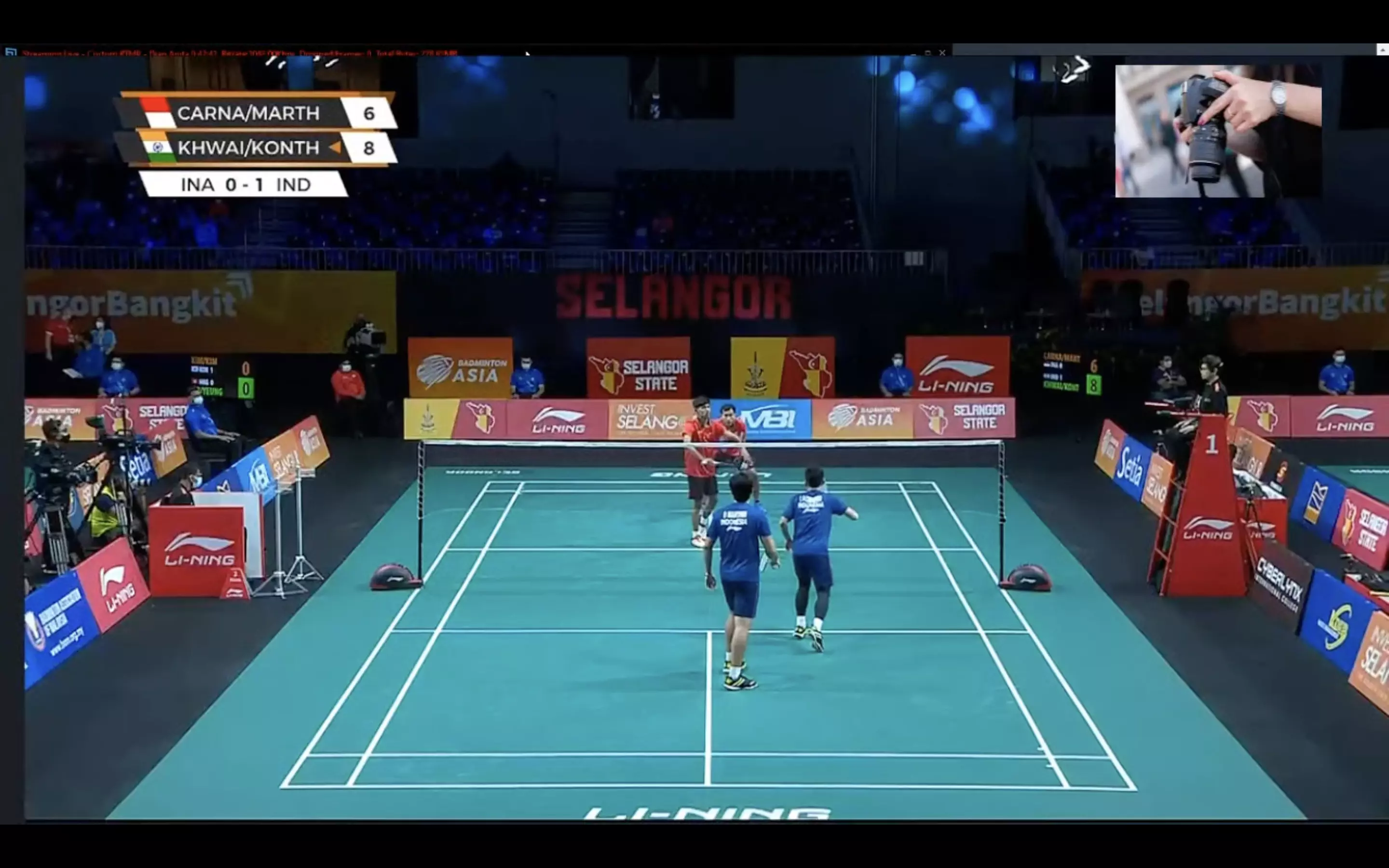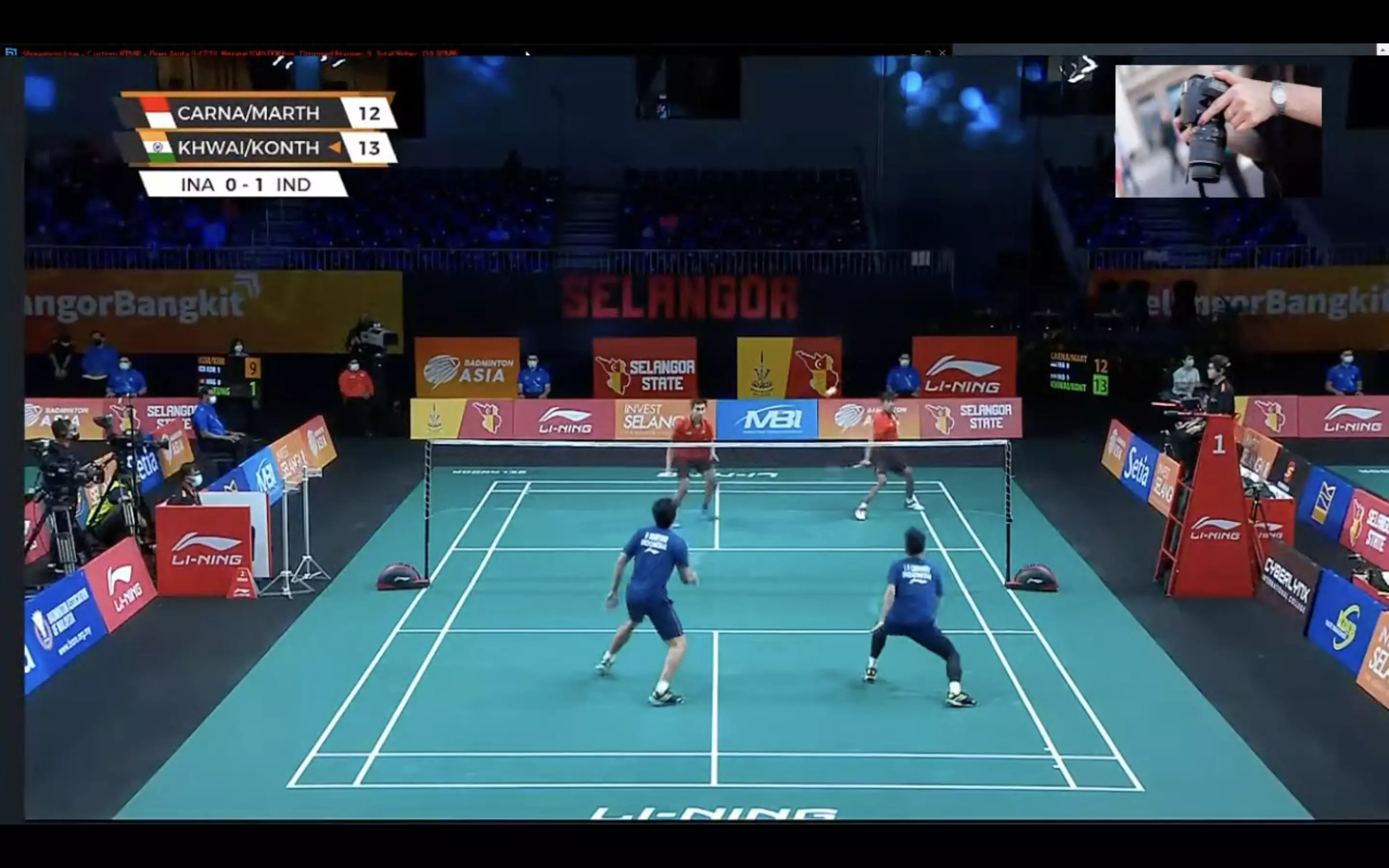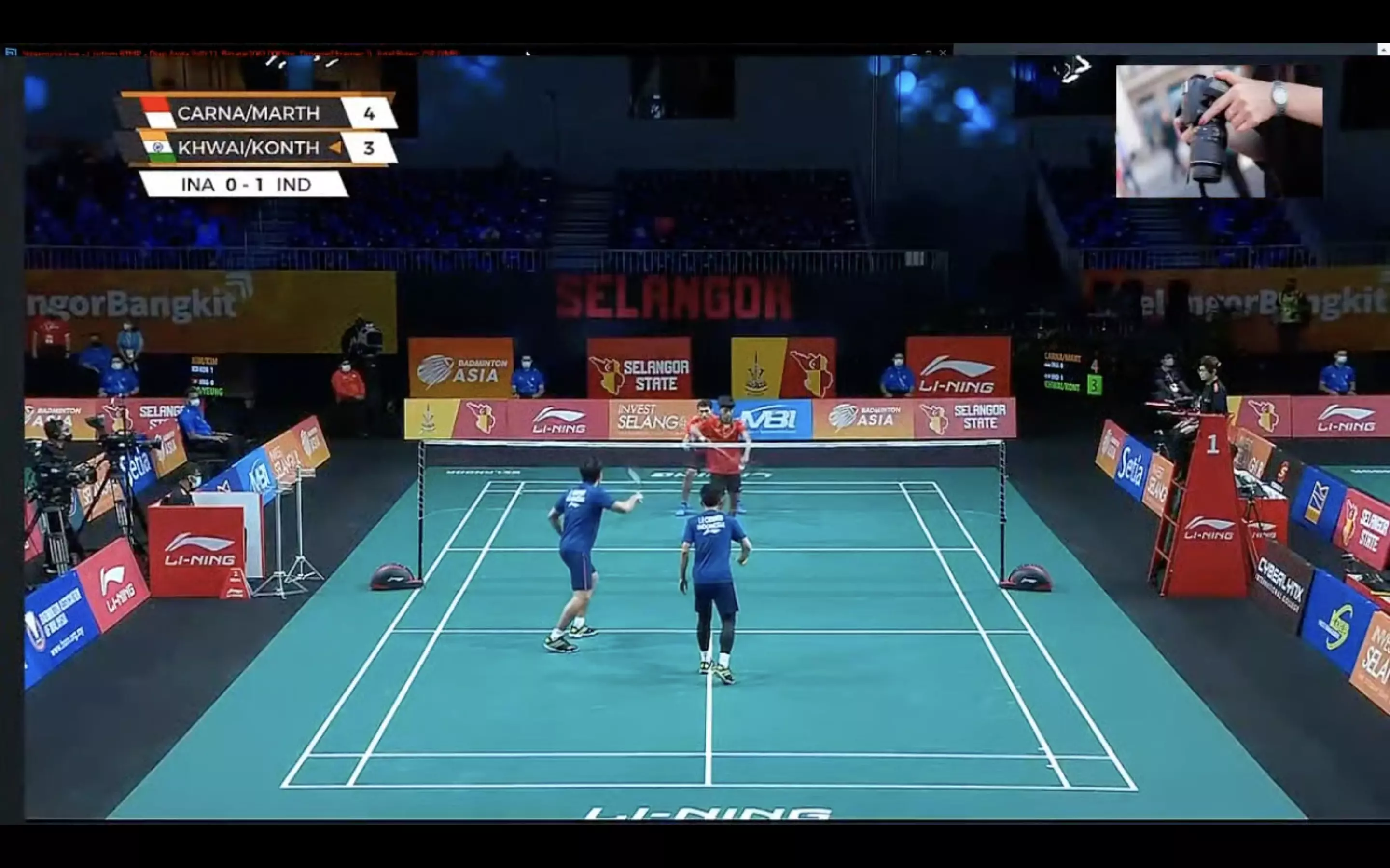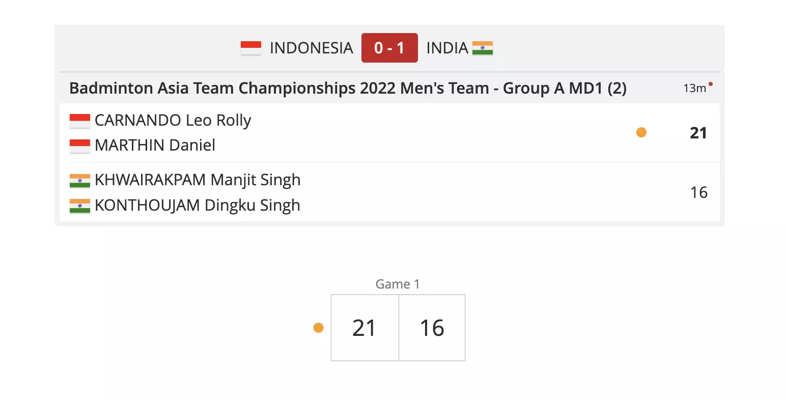 The Indonesian duo step up in the pressure points of the first game as Manjit-Dingku get on the back foot. The Indonesians win the first game, 21-16.