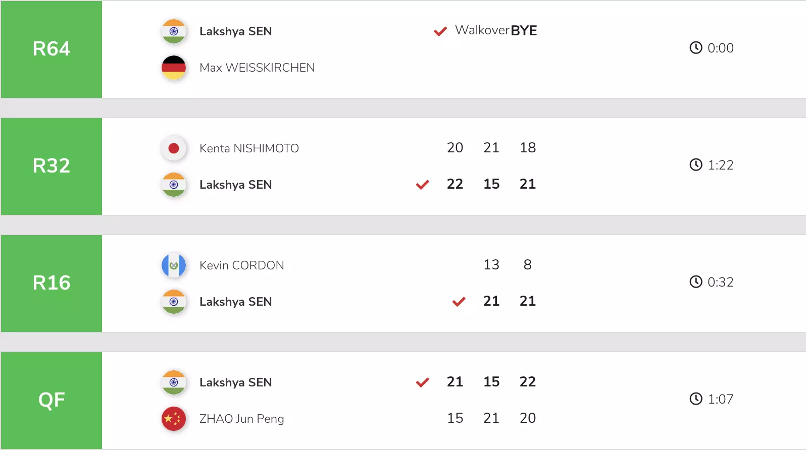 Lakshya Sen came out on top in a nail-biting match against China's Zhao Jun Peng, winning 21-15, 15-21, 22-20 in the quarterfinals.