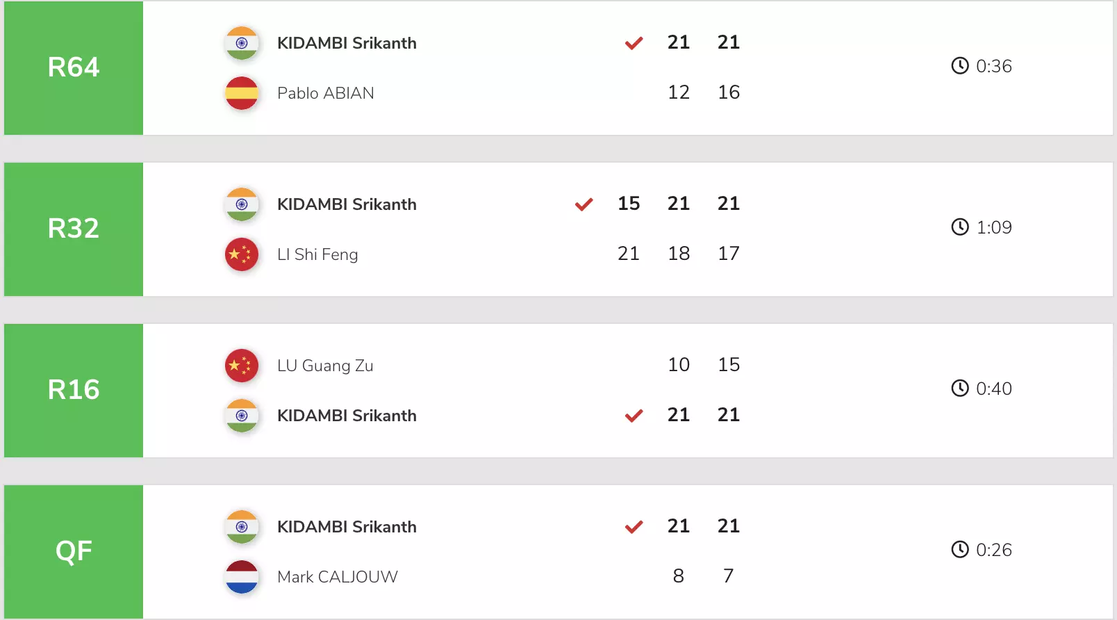 One more match remains to be played on Court 1 before Srikanth vs Lakshya.