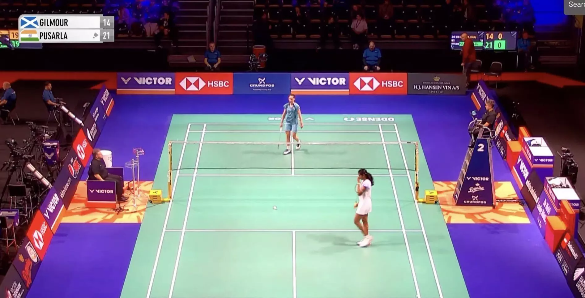 Sindhu wins the first game 21-14 comfortably against Gilmour.