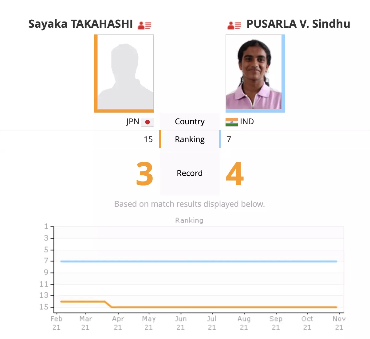 In the Head to Head between PV Sindhu and Sayaka Takahashi, Sindhu has had the last word on 4 occasions while Takahashi has been on the winning side thrice.