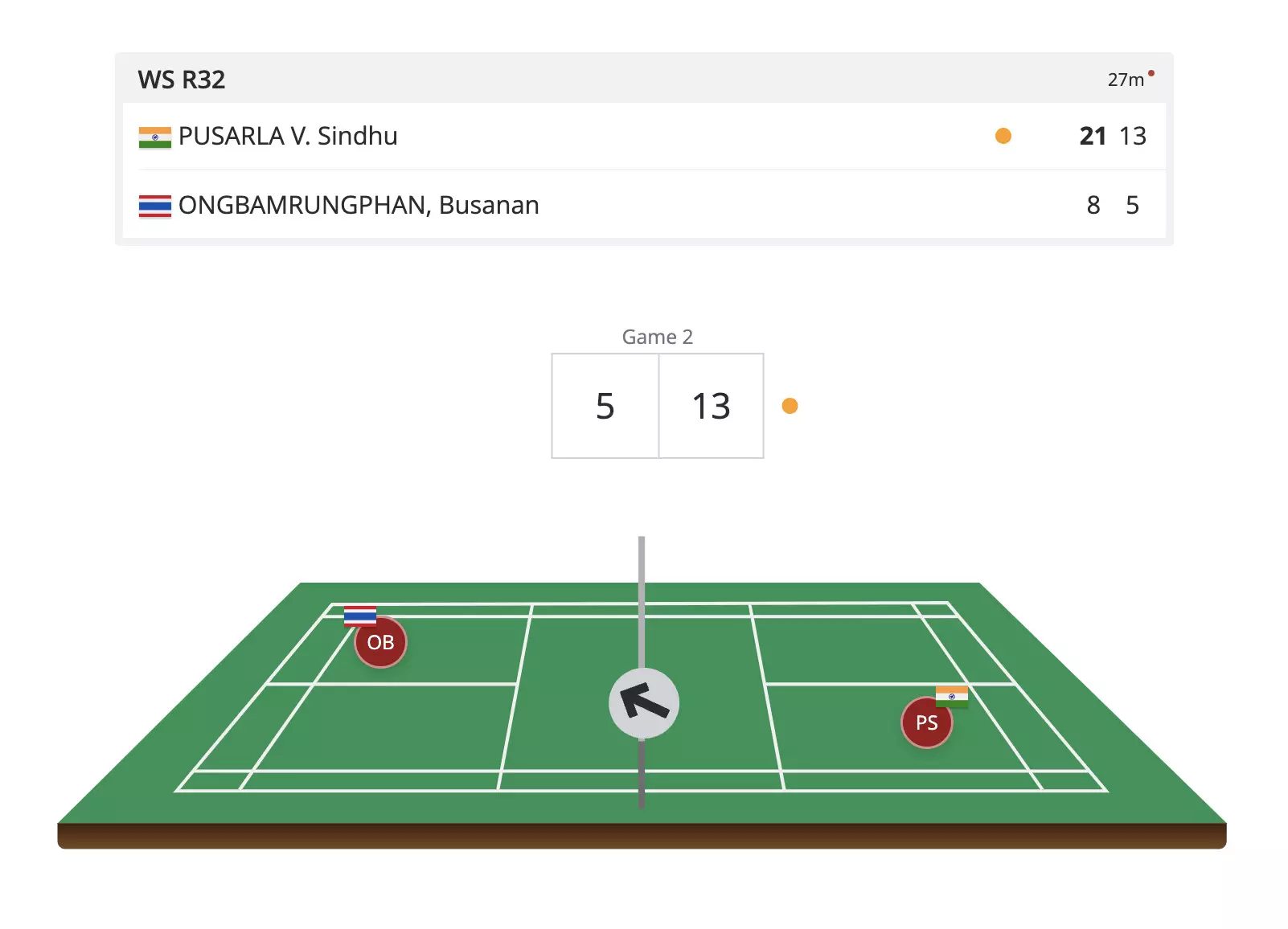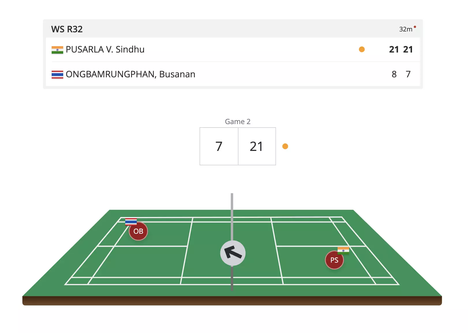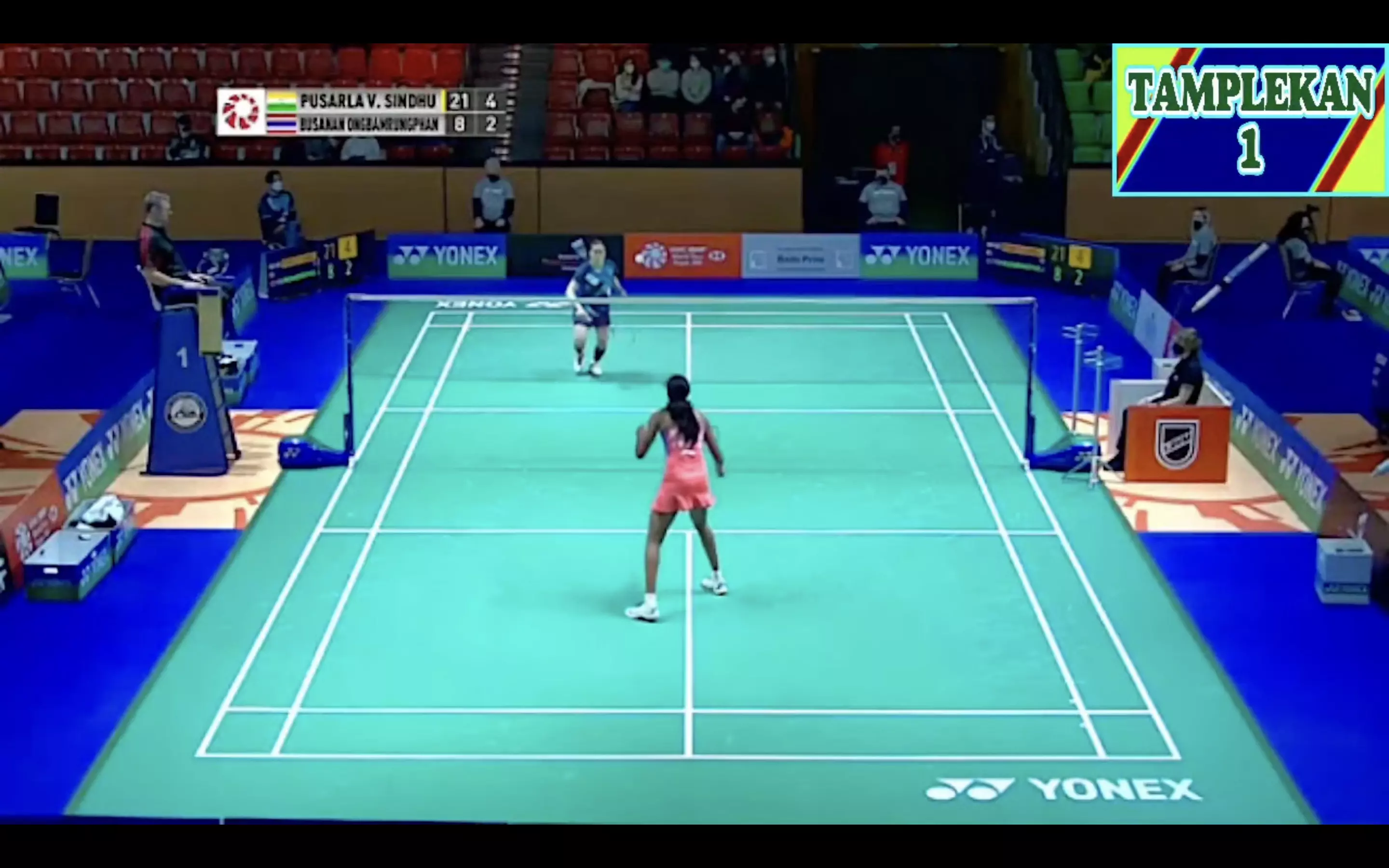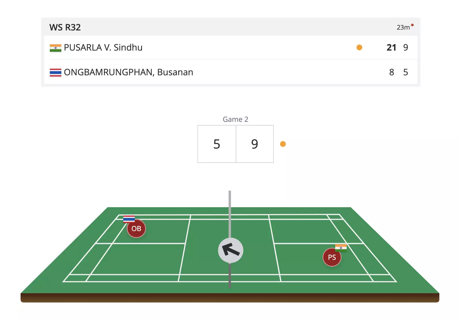 PV Sindhu sweeps the shuttle to various corners for her returns and shows good variety as usual. Busanan is on the back foot majorly and is being bullied around by Sindhu.