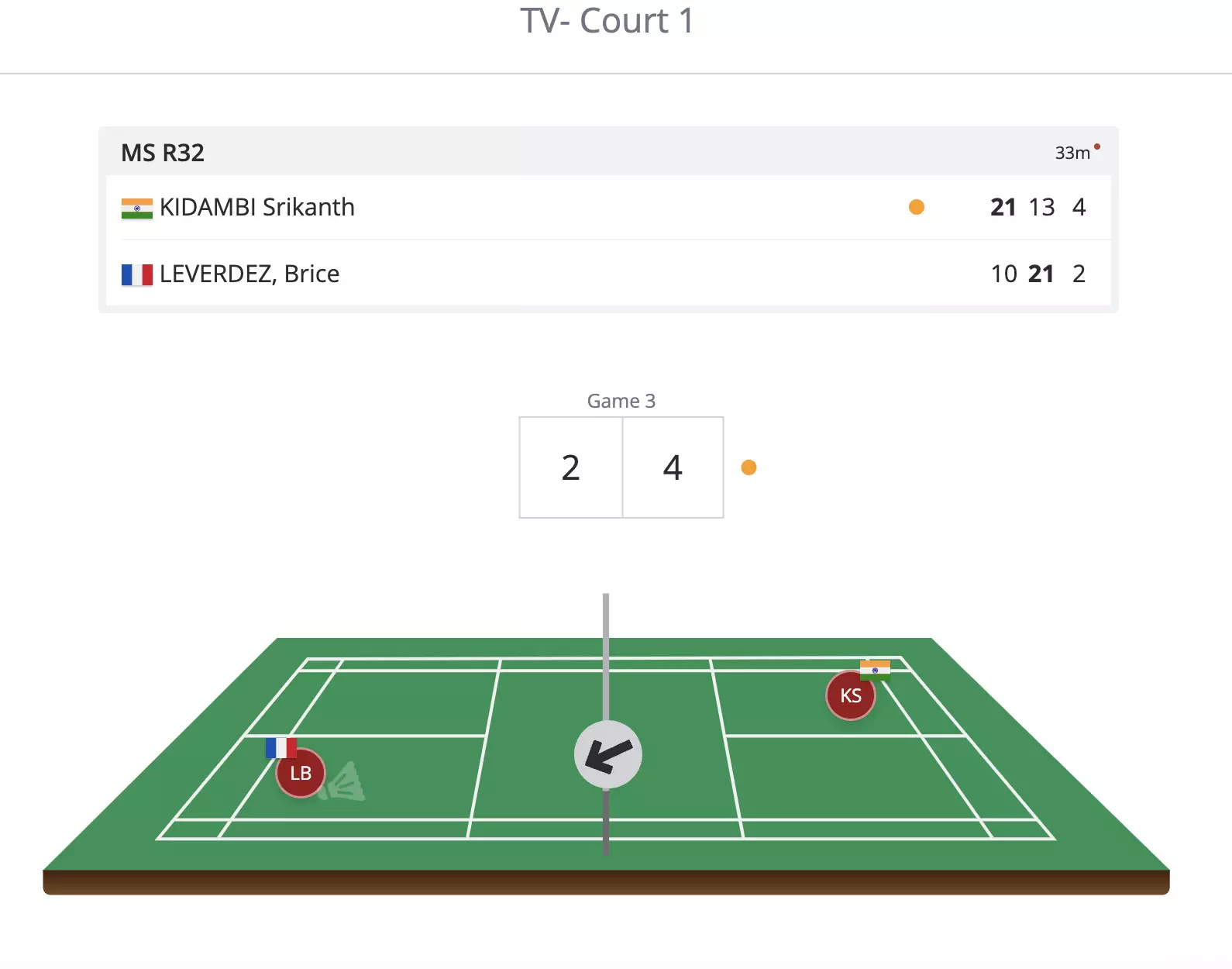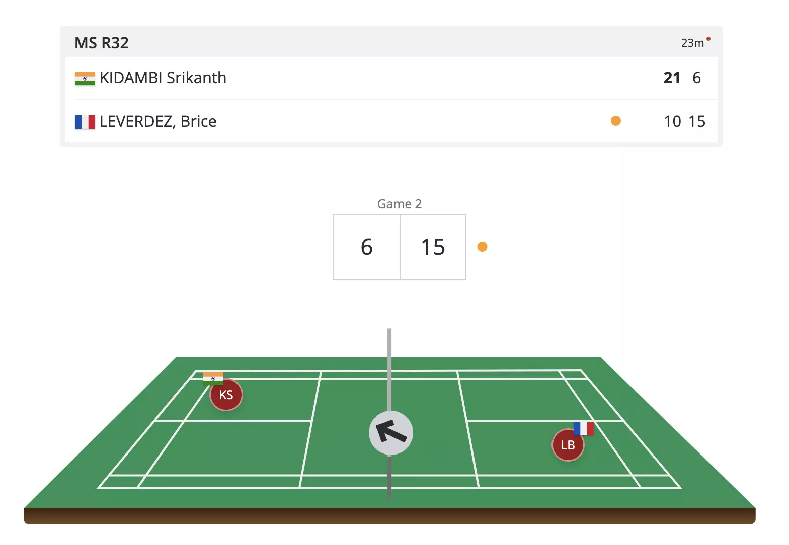 Bit of trouble for Kidambi Srikanth now as Brice Leverdez is putting pressure and Kidambi's net game is suddenly not so perfect as usual.