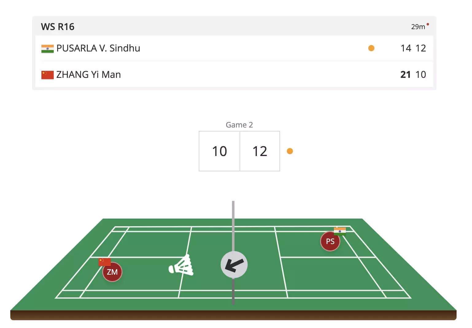Sindhu is having to work hard for the points here as Zhang keeps the pressure on the Sindhu serve. The Indian leads at 12-10 in the second game. Come on, Sindhu!