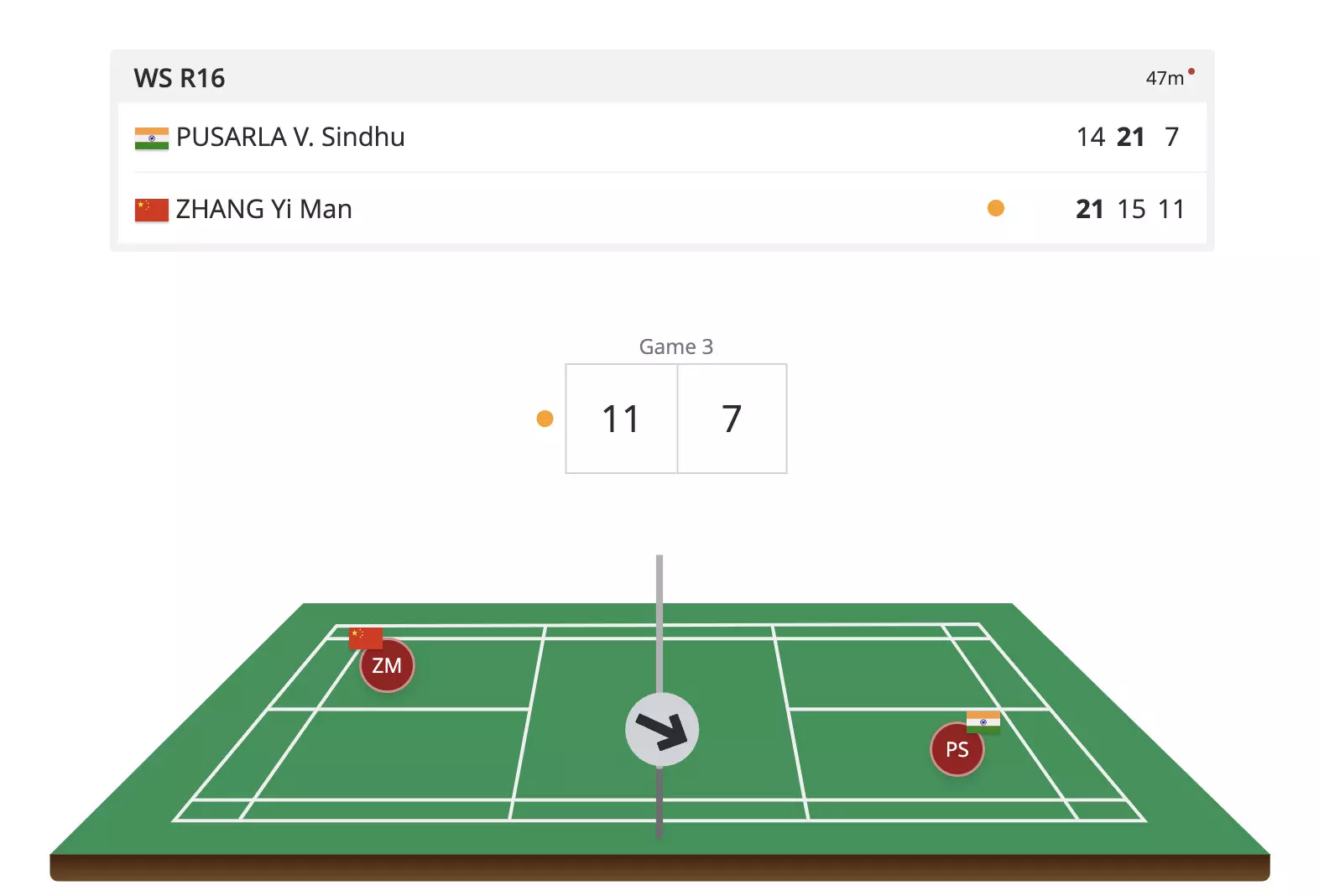 Zhang gets to the mid-game break of the decider with a 7-11 lead. Pressure is back on Sindhu! Her net errors are costing her today.
