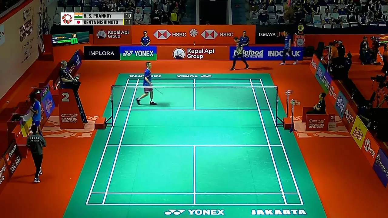 Prannoy hits wide as Kenta Nishimoto goes in the mid-game break with a lead of 11-10.