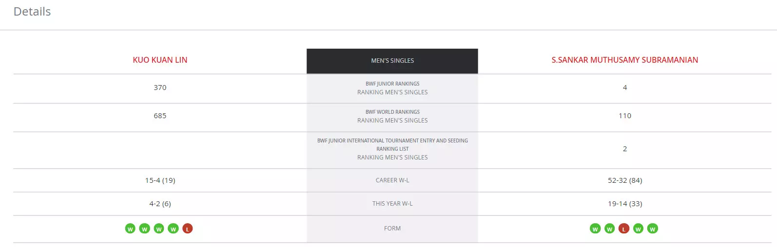 Sankar Muthusamy is way higher ranked compared to his opponent. Take a look at how they stack up against each other.