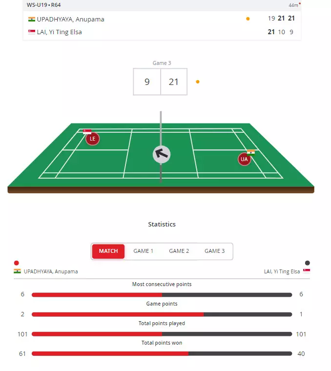 She cruises to a win at the end does Anupama Upadhyay. A 44-minute battle, but the Indian emerges from a game down to win 19-21, 21-10, 21-9. Off goes Anupama to the Round of 32!