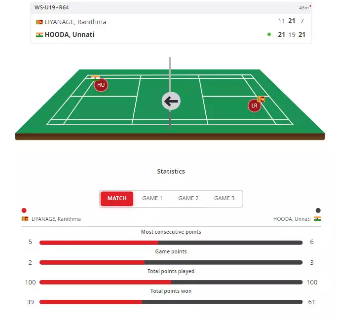 Much like Anupama, Unnati Hooda obliterates her opponent in the decider to move into the Round of 32. She wins 21-11, 19-21, 21-7 in 43 minutes!