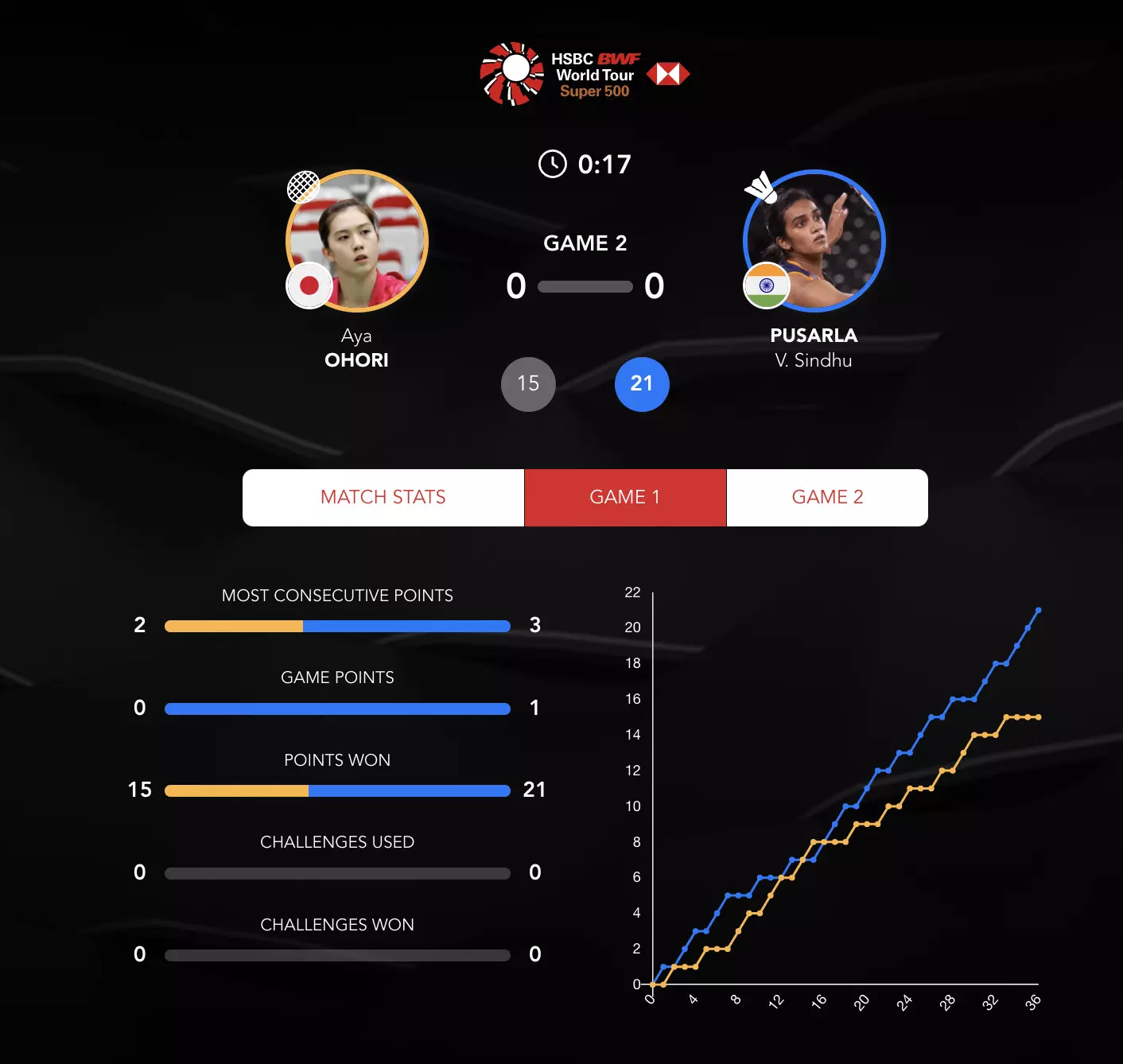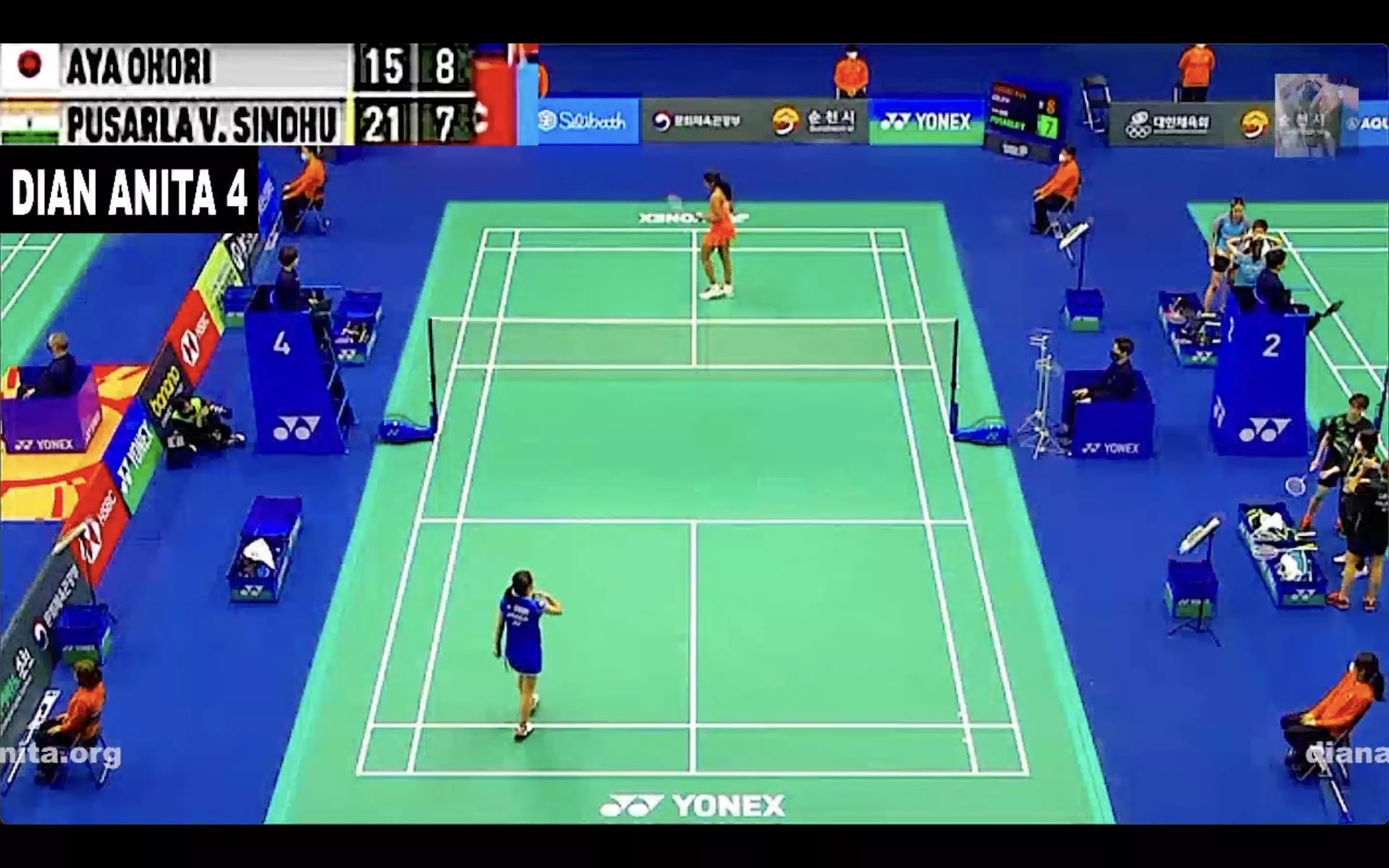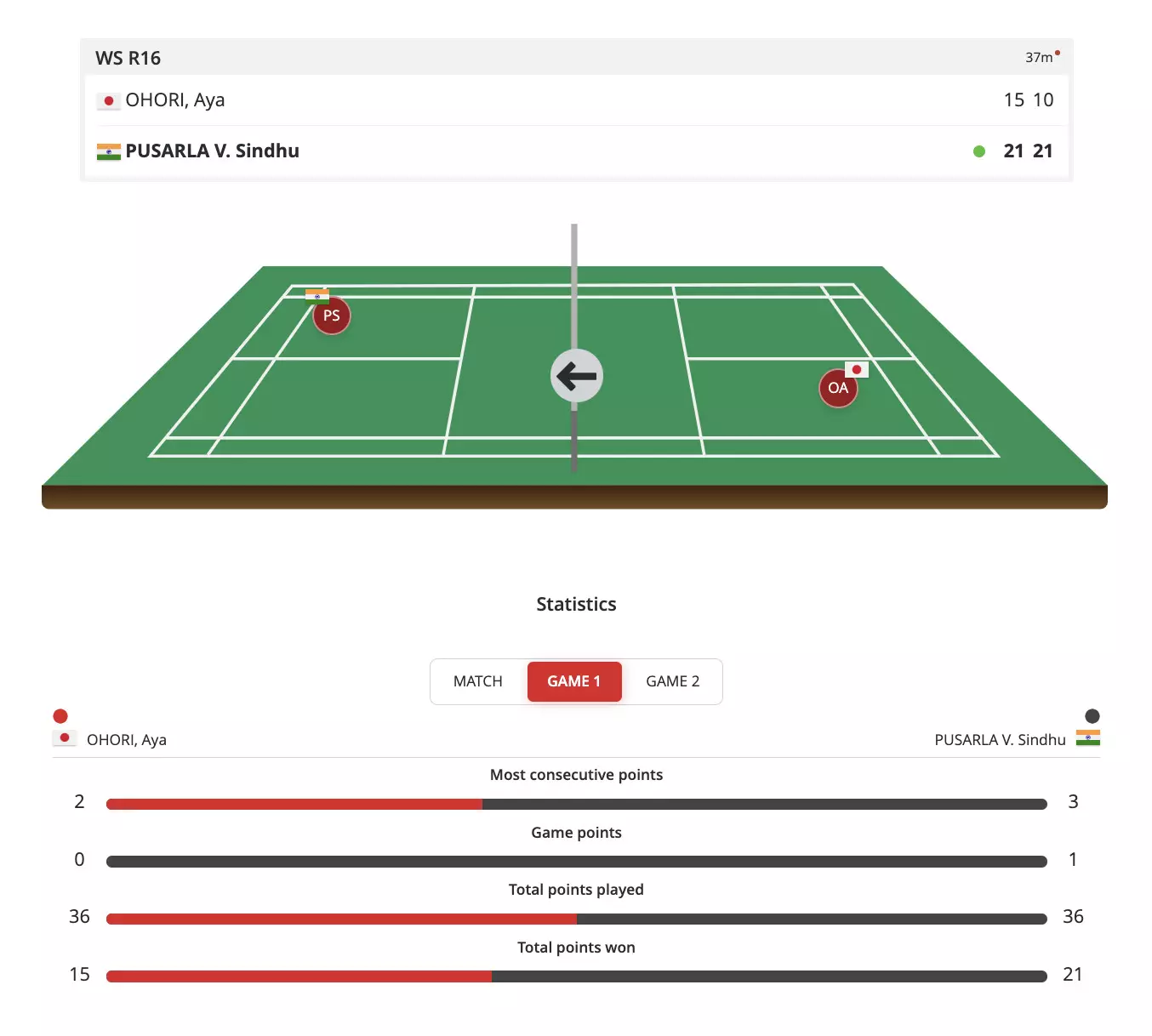 Ohori makes a better start in Game 2 and takes the lead but Sindhu comes in with her cross-court smashes while Ohori also commits a few errors.