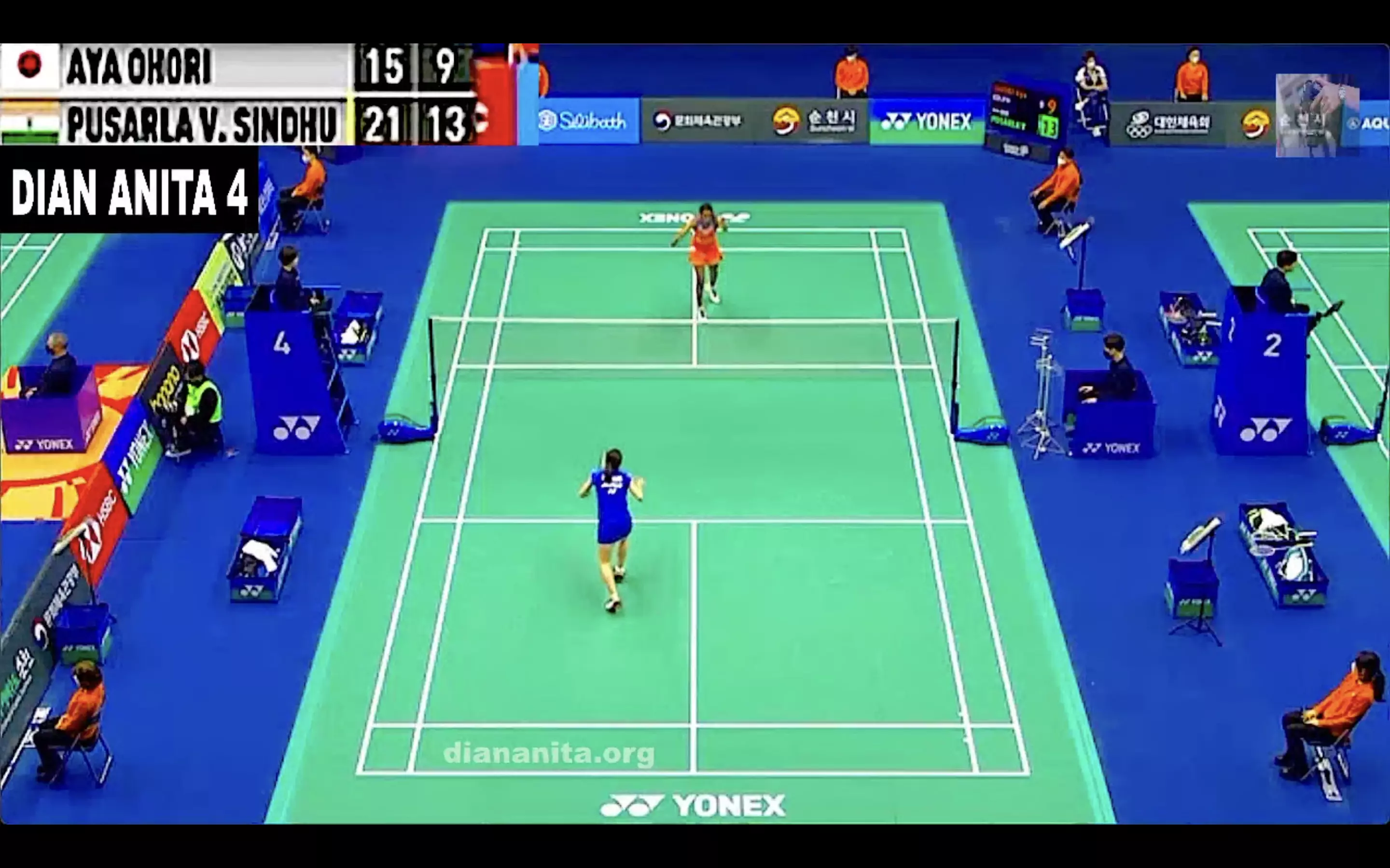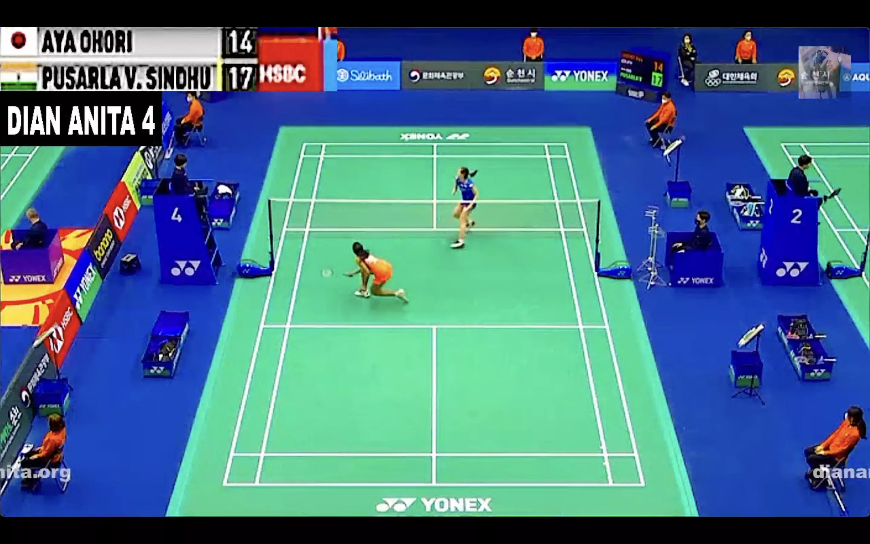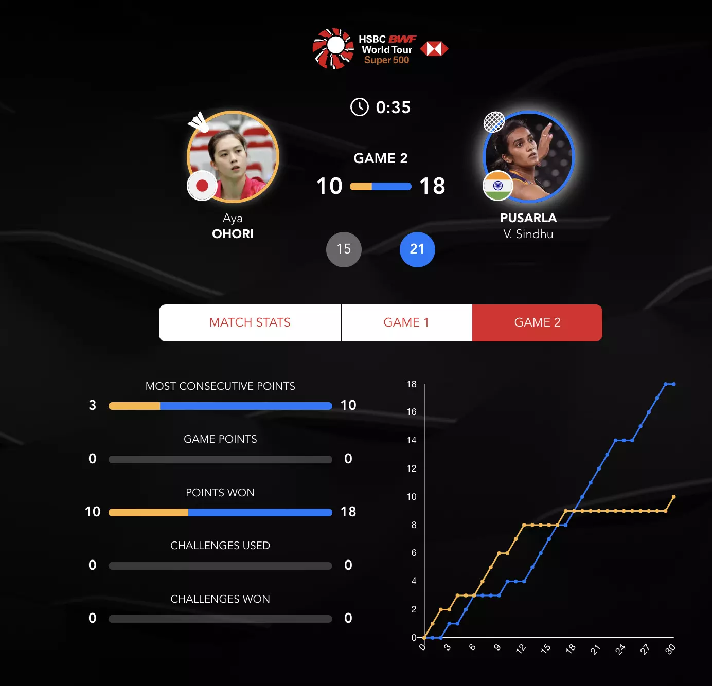 Ohori makes a better start in Game 2 and takes the lead but Sindhu comes in with her cross-court smashes while Ohori also commits a few errors.