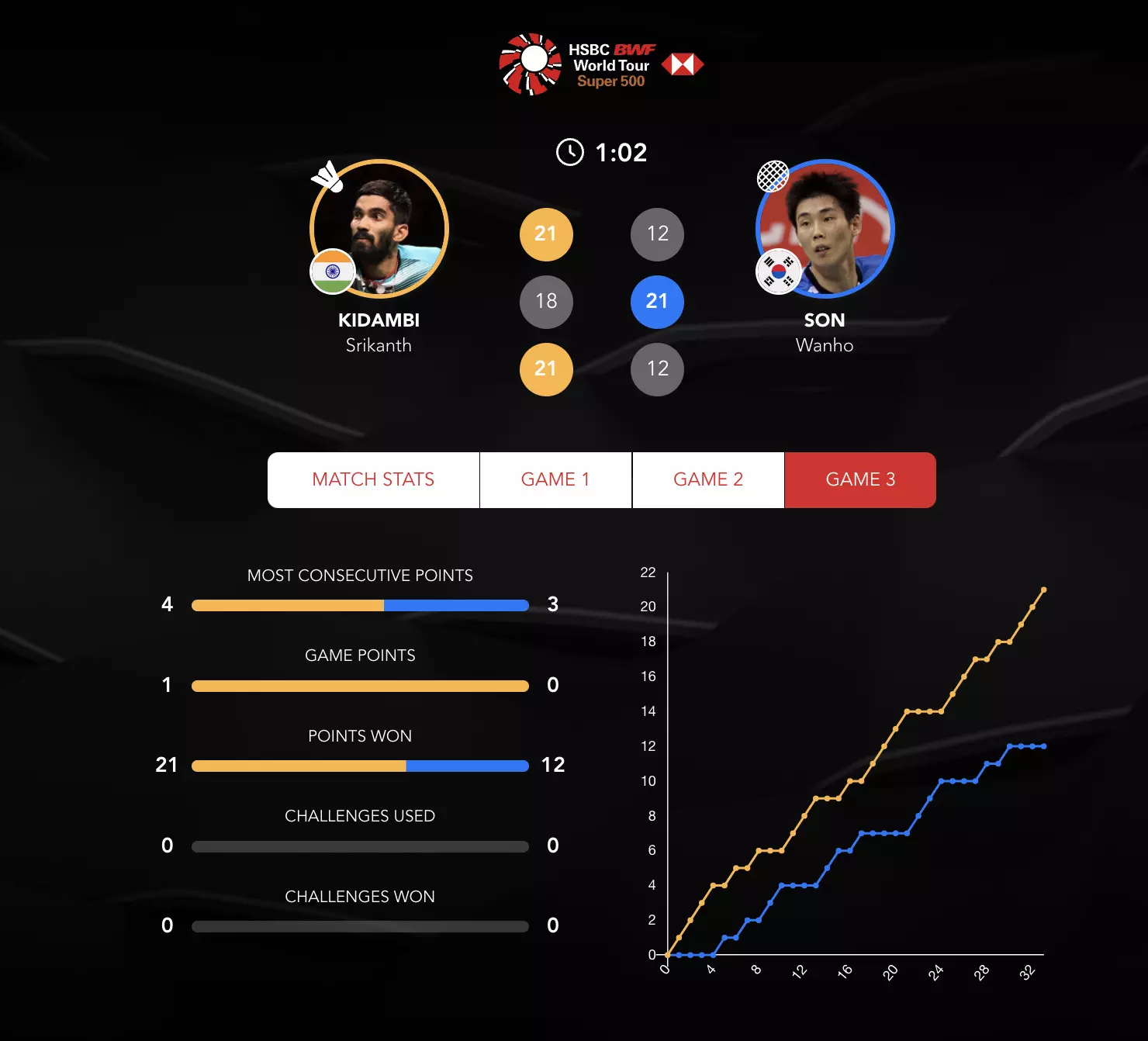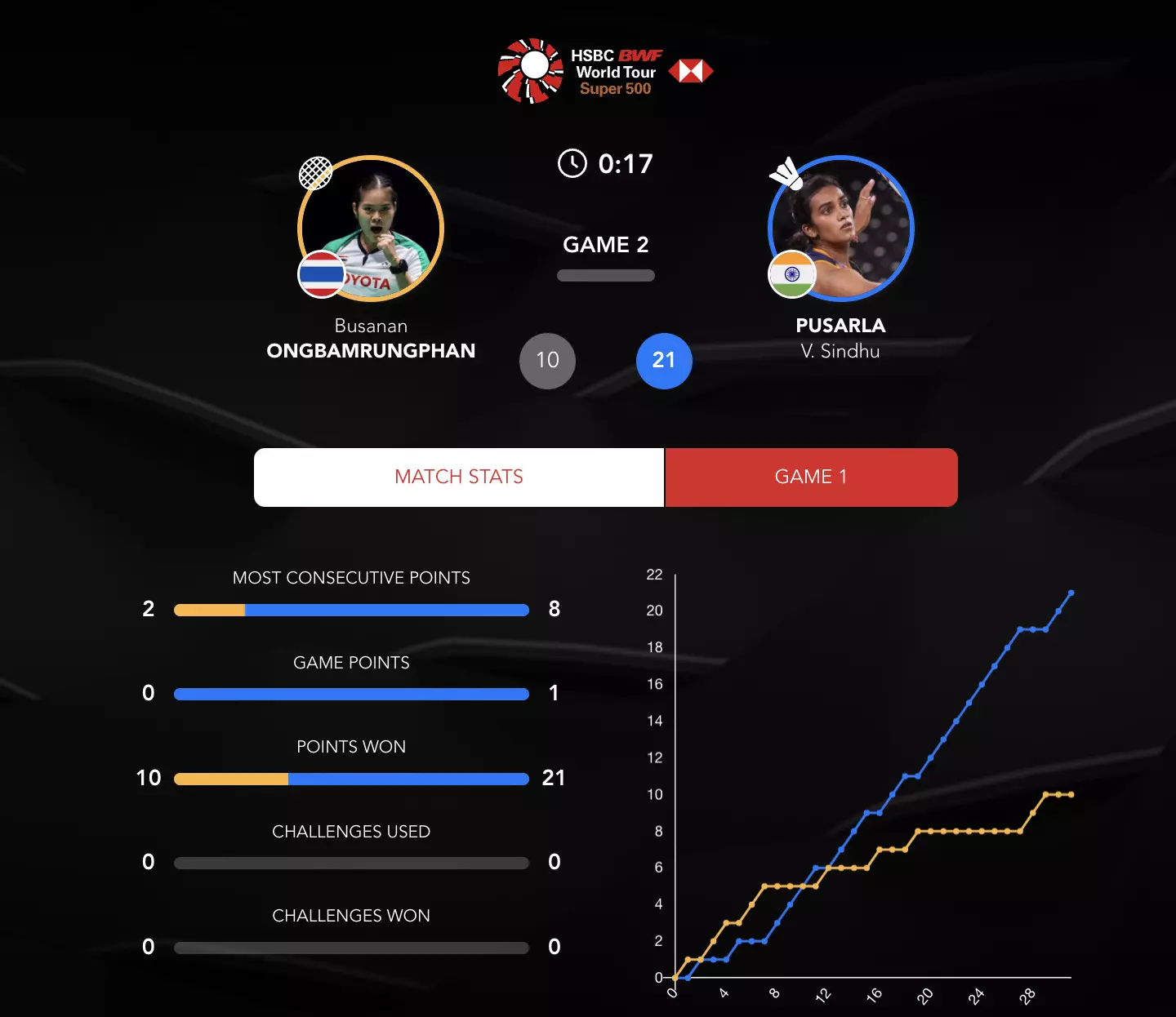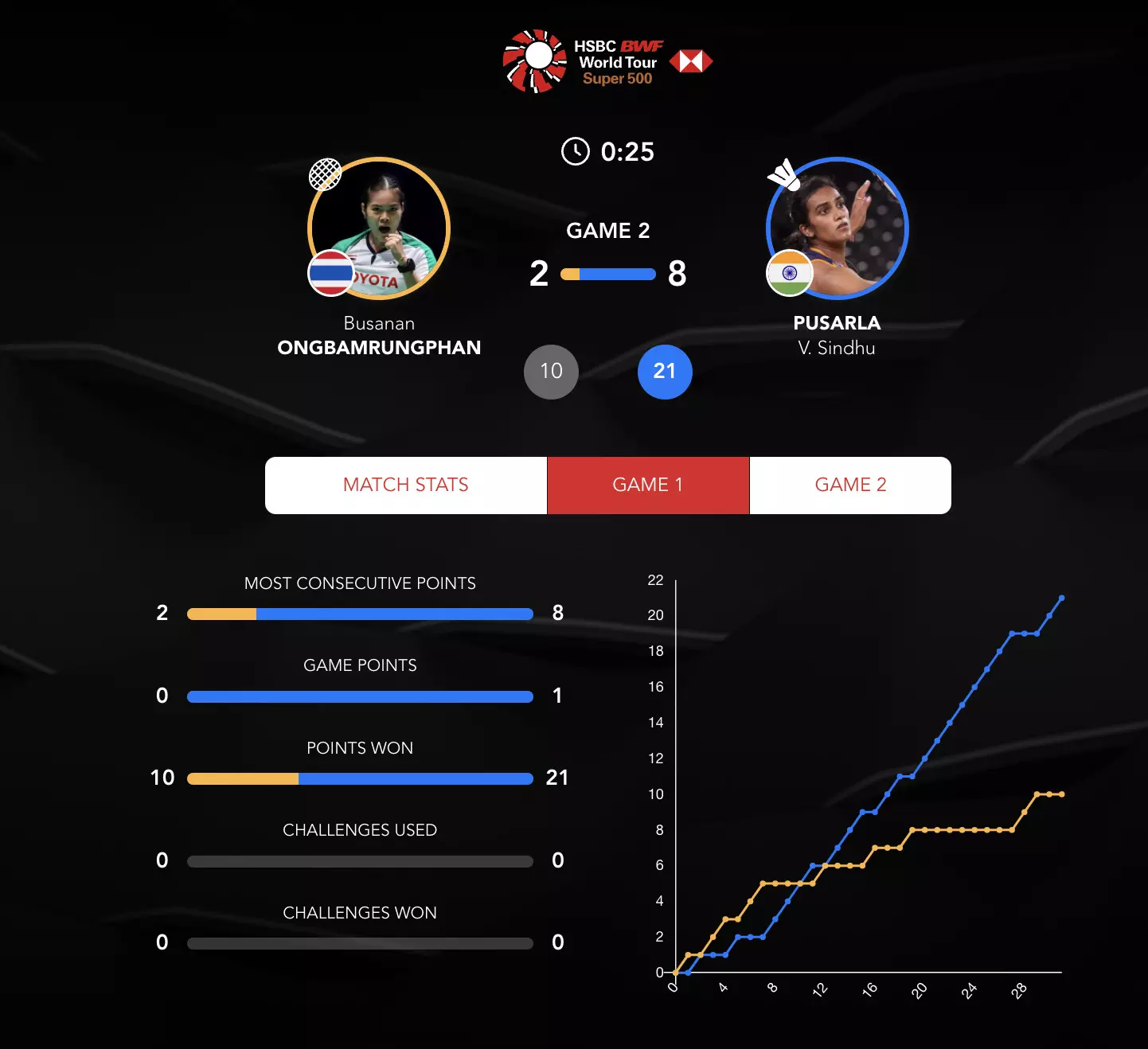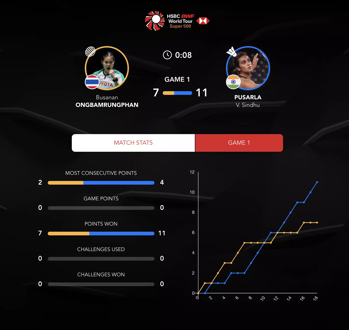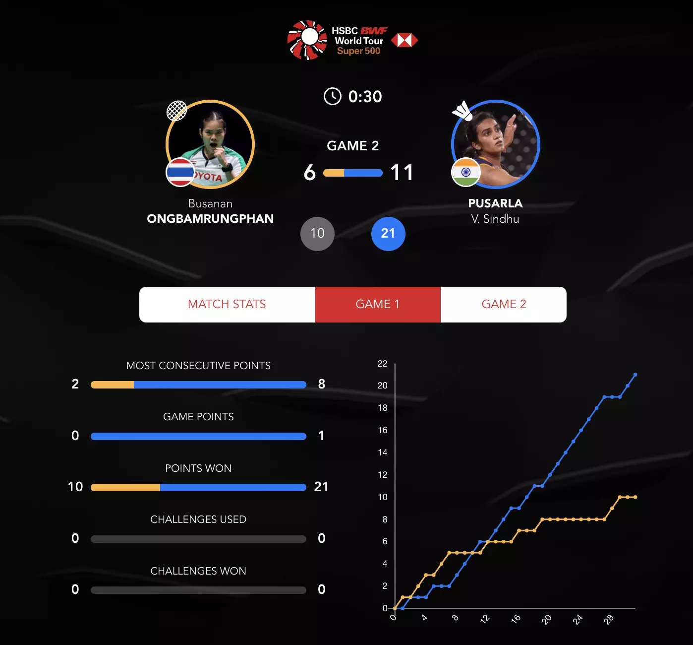 Sindhu looks calm and composed here as she takes the lead at the mid-game interval of Game 2. Busanan is struggling here from Sindhu's attacks.