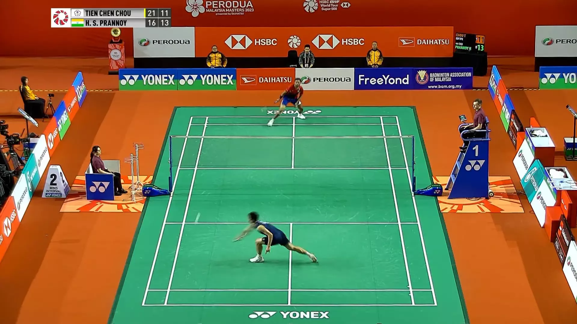After a tiring rally, Prannoy hits the winner with a bit of assistance from the net.