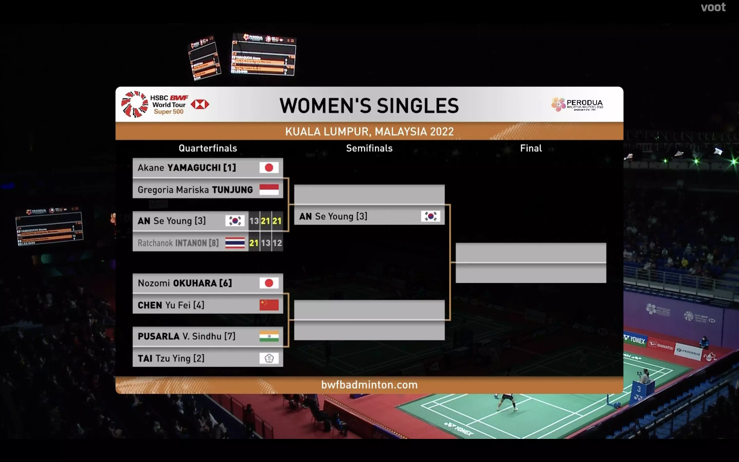 ASY dominates the last two games of the match and ousts Ratchanok Intanon to reach the semi-finals of the Malaysia Masters for the first time in her career, 21-13, 13-21, 12-21.