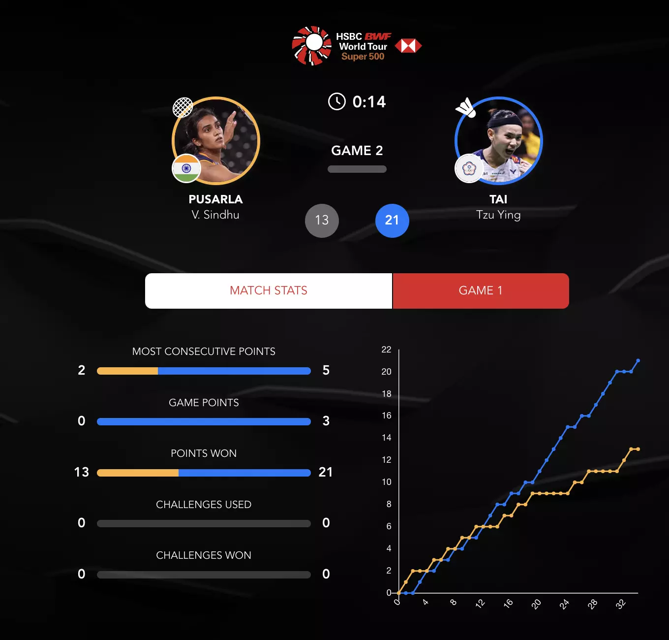 TTY is being tactful and Sindhu has a 2-point difference to make up as TTY gets into groove and leads 11-9