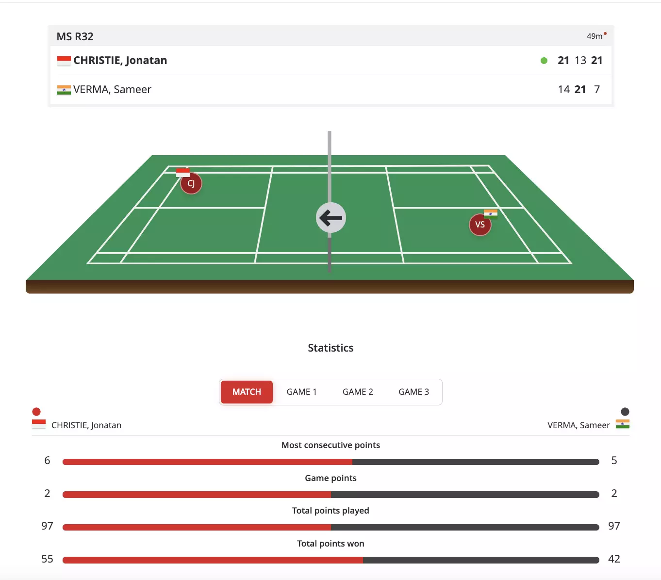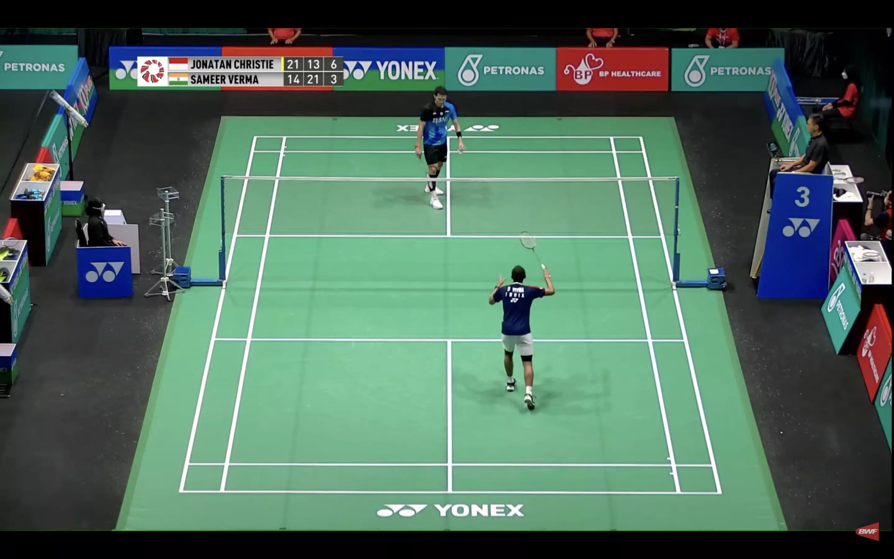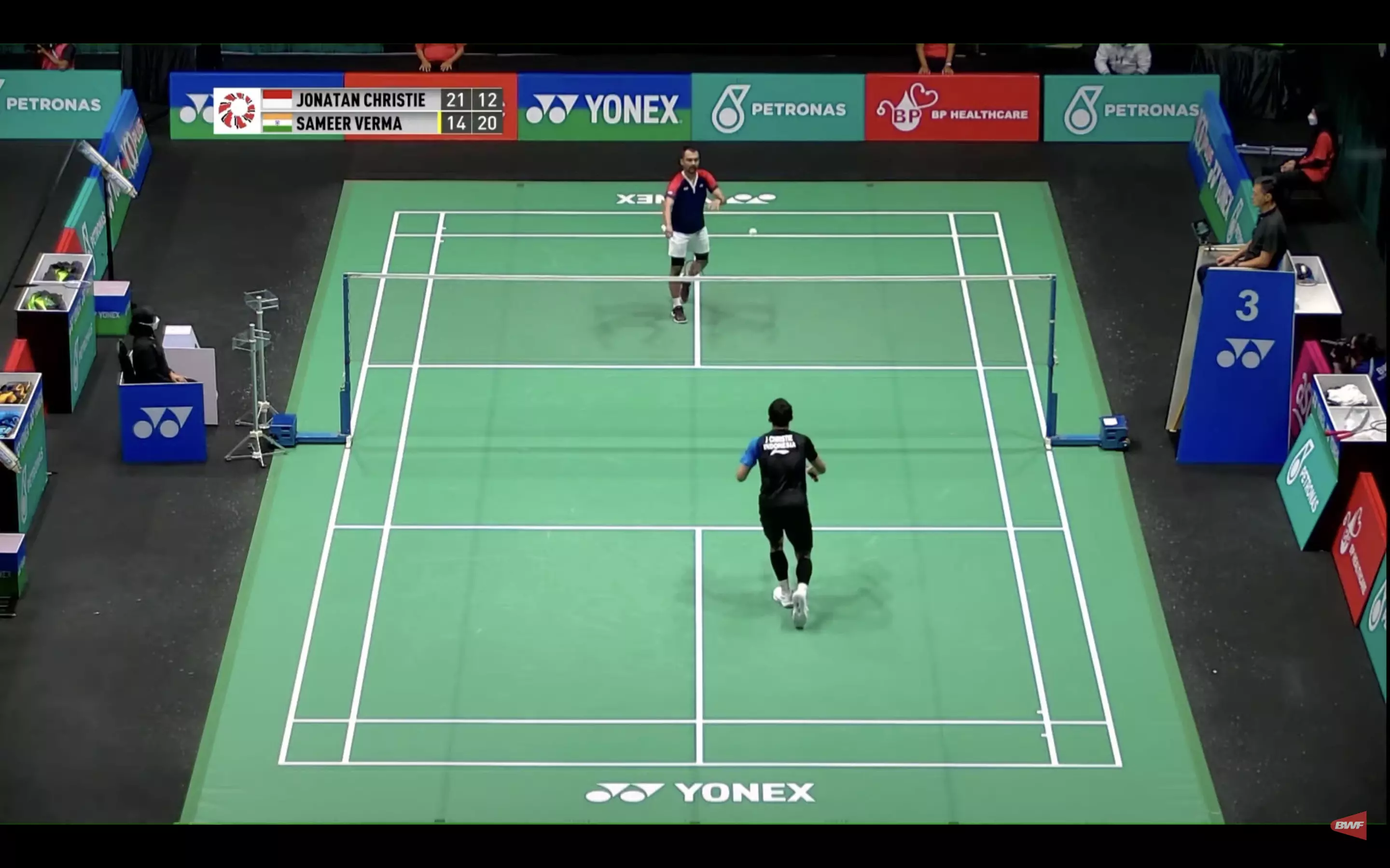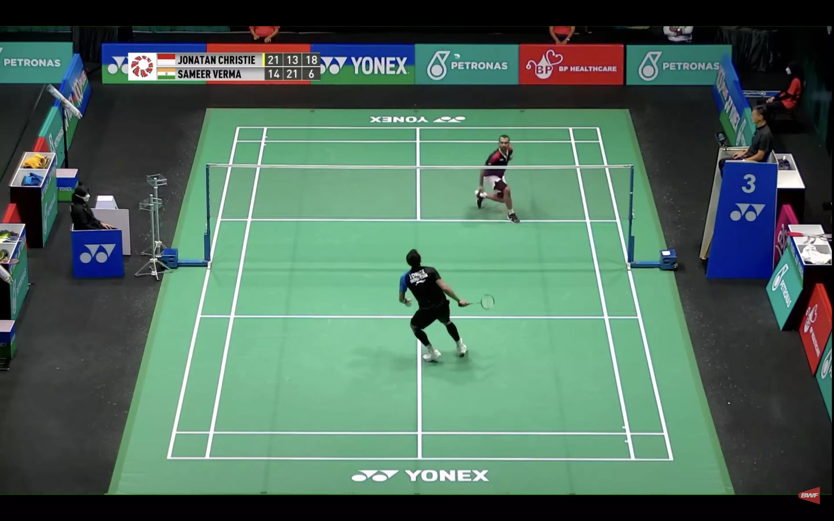 Jonatan Christie powers through as Sameer Verma has some difficulty returning a few shots. Christie leads 11-4, Verma has a lot of covering up to do!