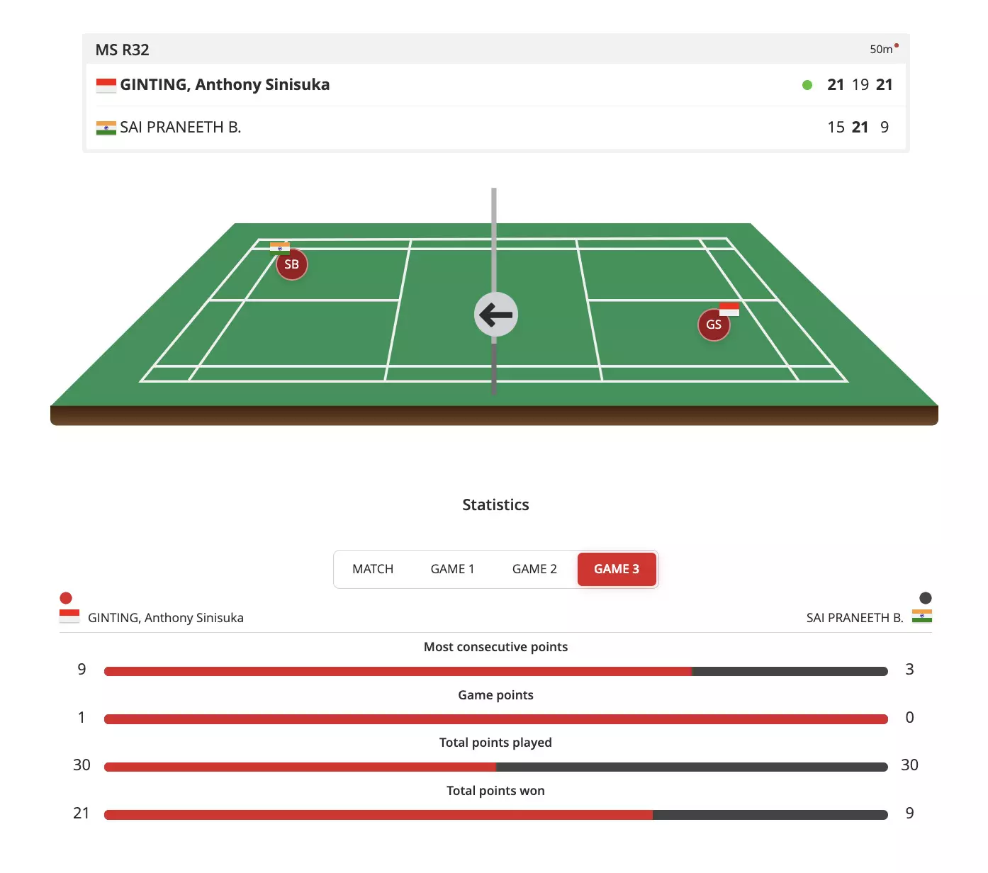It's the end of the road for Sai Praneeth at the Malaysia Open 2022 as Ginting powers through and defeats Praneeth, 21-15, 19-21, 21-9 in 50 mins.