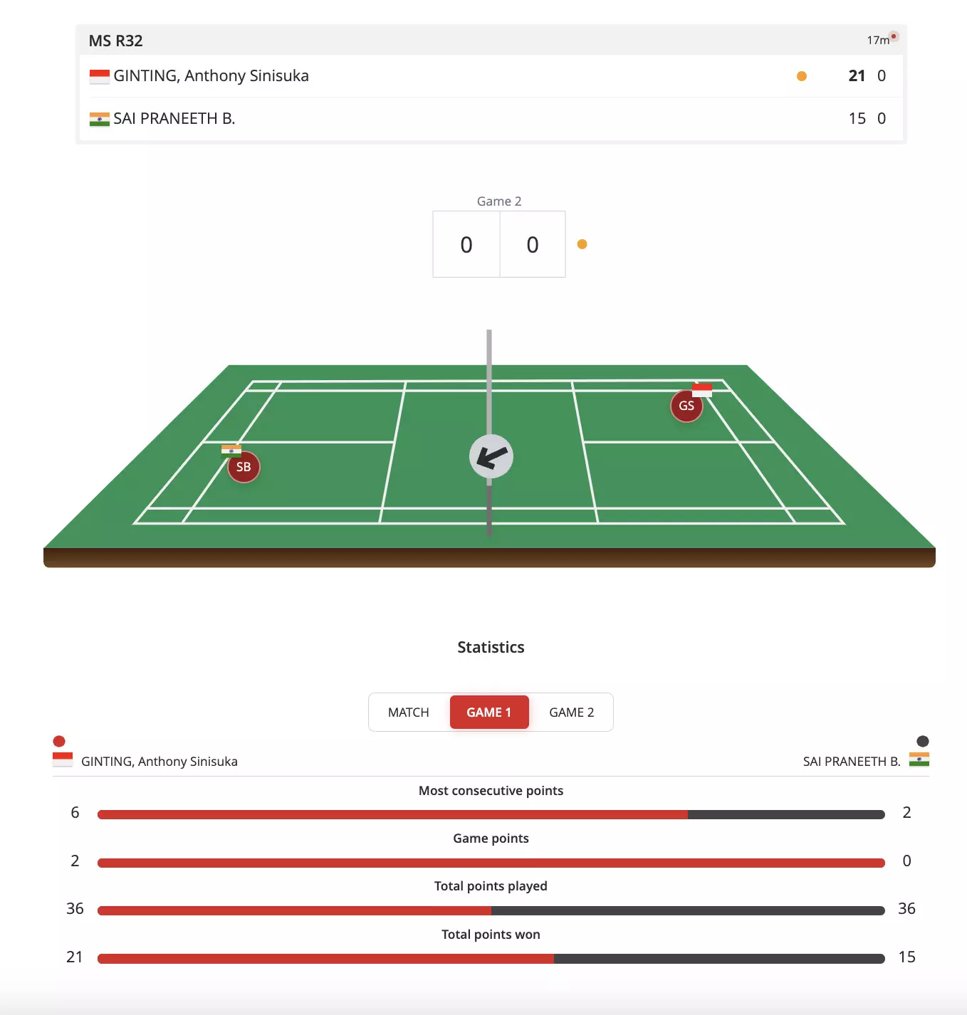 Ginting leads 16-9 and has really got the momentum on his side as the unforced errors increase for Praneeth