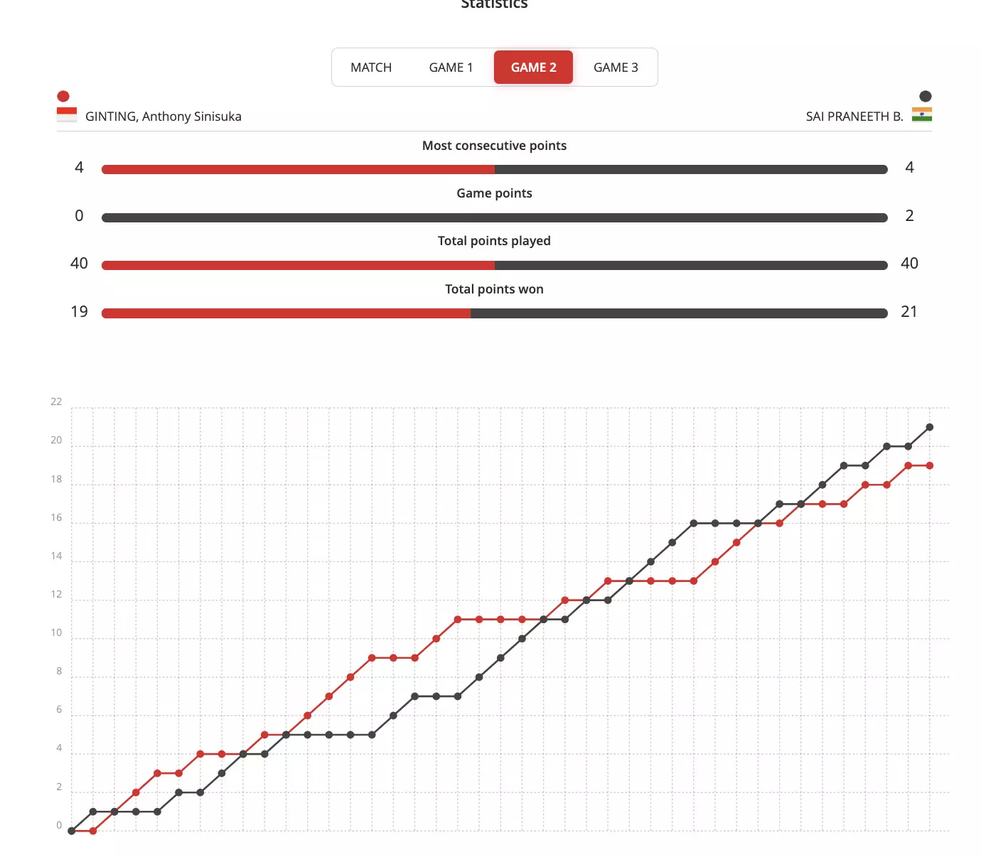 It's a closer fight in Game 2 and Sai Praneeth wins it at 21-19! We are into a decider!
