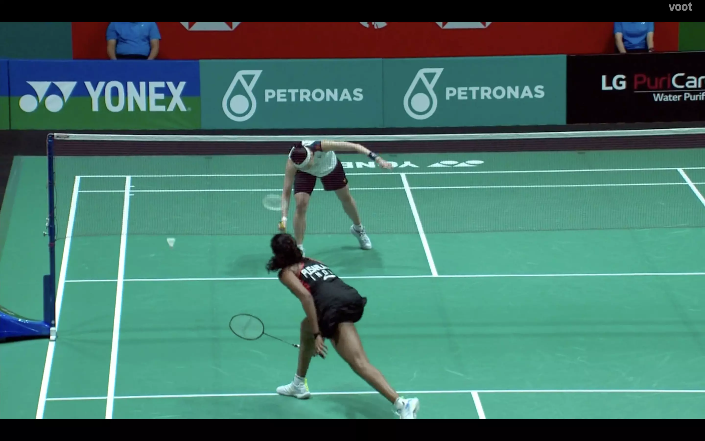 PV Sindhu races off to a lead at 11-7 in the mid-game interval as she gets lucky as well with a precious net shot!