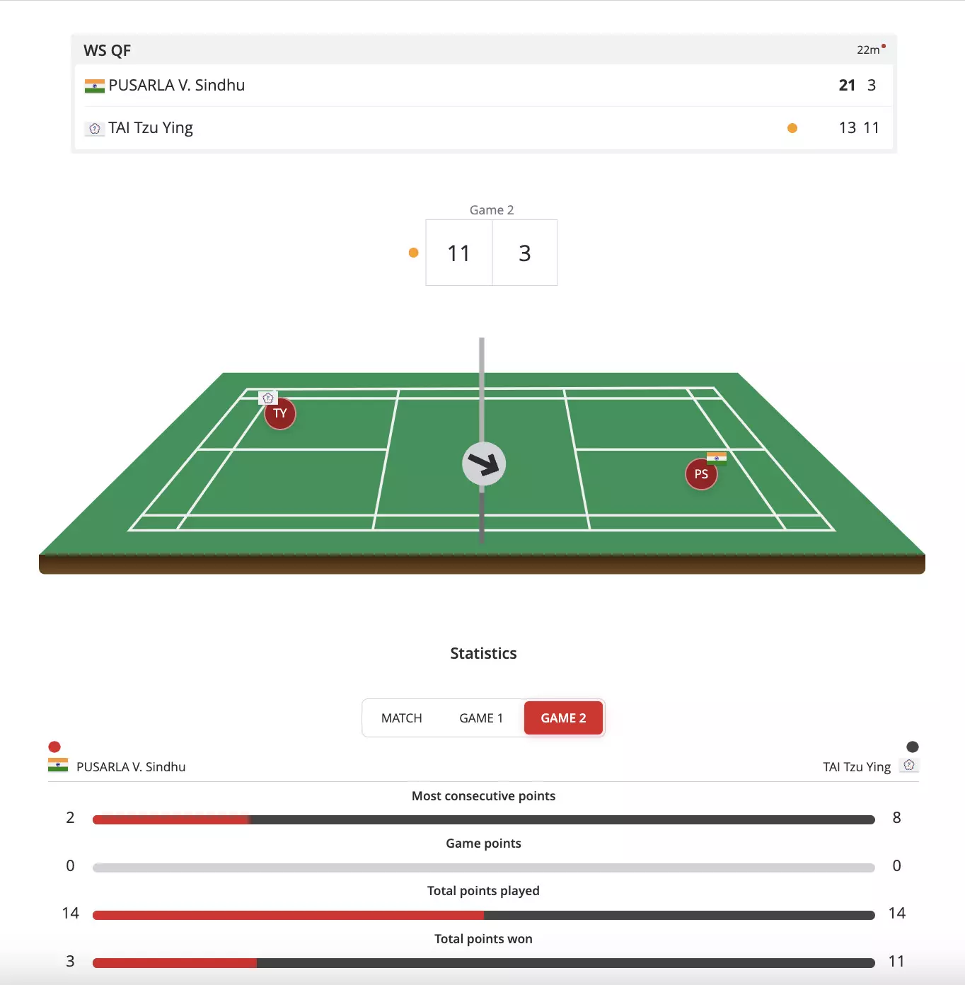 In the women's singles, double Olympic medallist PV Sindhu took on Tokyo silver medallist Tai Tzu-ying for a place in the semi-finals and lost 21-13, 15-21, 13-21 against the defending champion from Chinese Taipei.